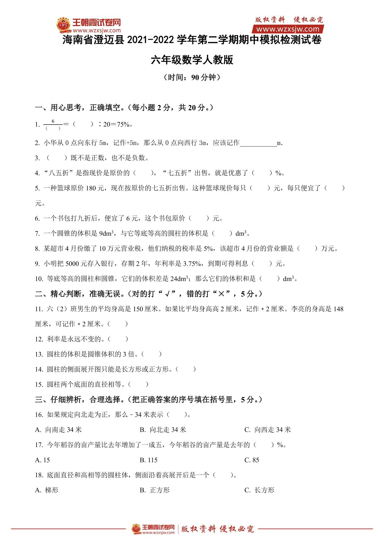 海南省澄迈县2021-2022学年第二学期期中模拟检测试卷六年级数学(人教版)