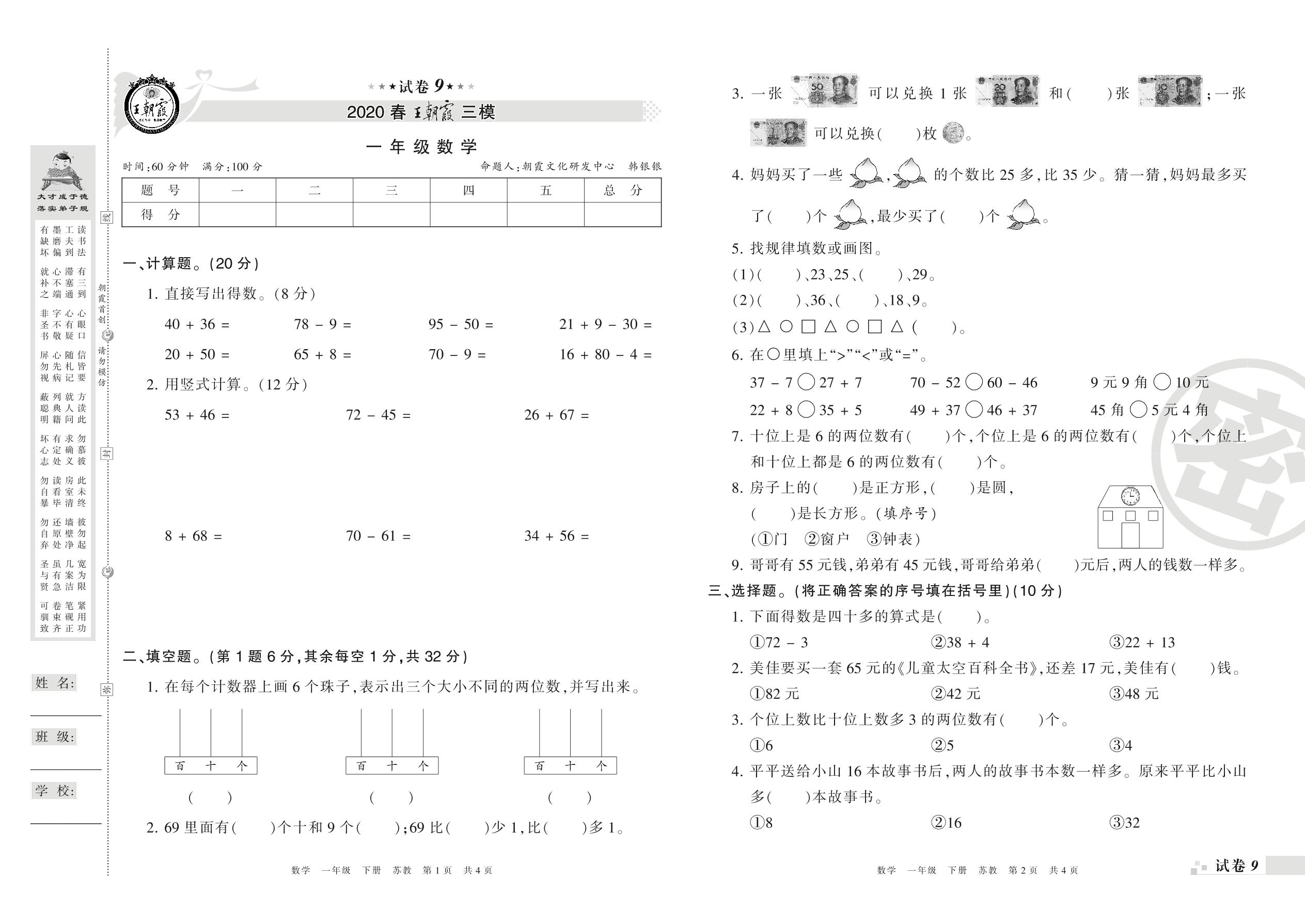 王朝霞期末模拟卷一年级下册数学(苏教版)_R210802213619【9】