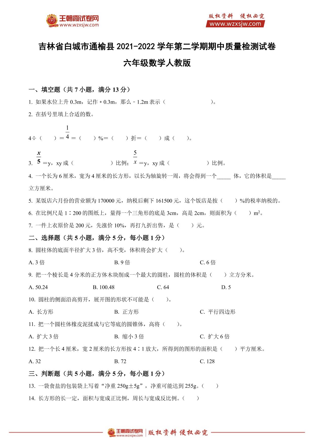 吉林省白城市通榆县2021-2022学年第二学期期中质量检测试卷六年级数学(人教版)