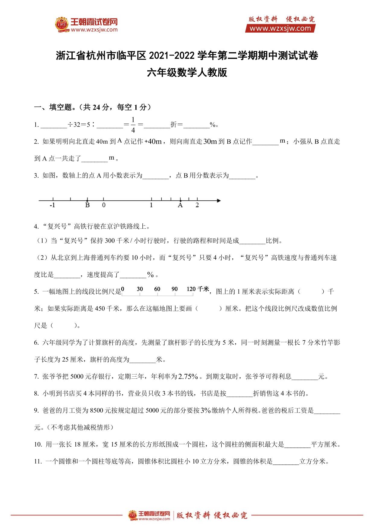 浙江省杭州市临平区2021-2022学年第二学期期中测试试卷六年级数学(人教版)