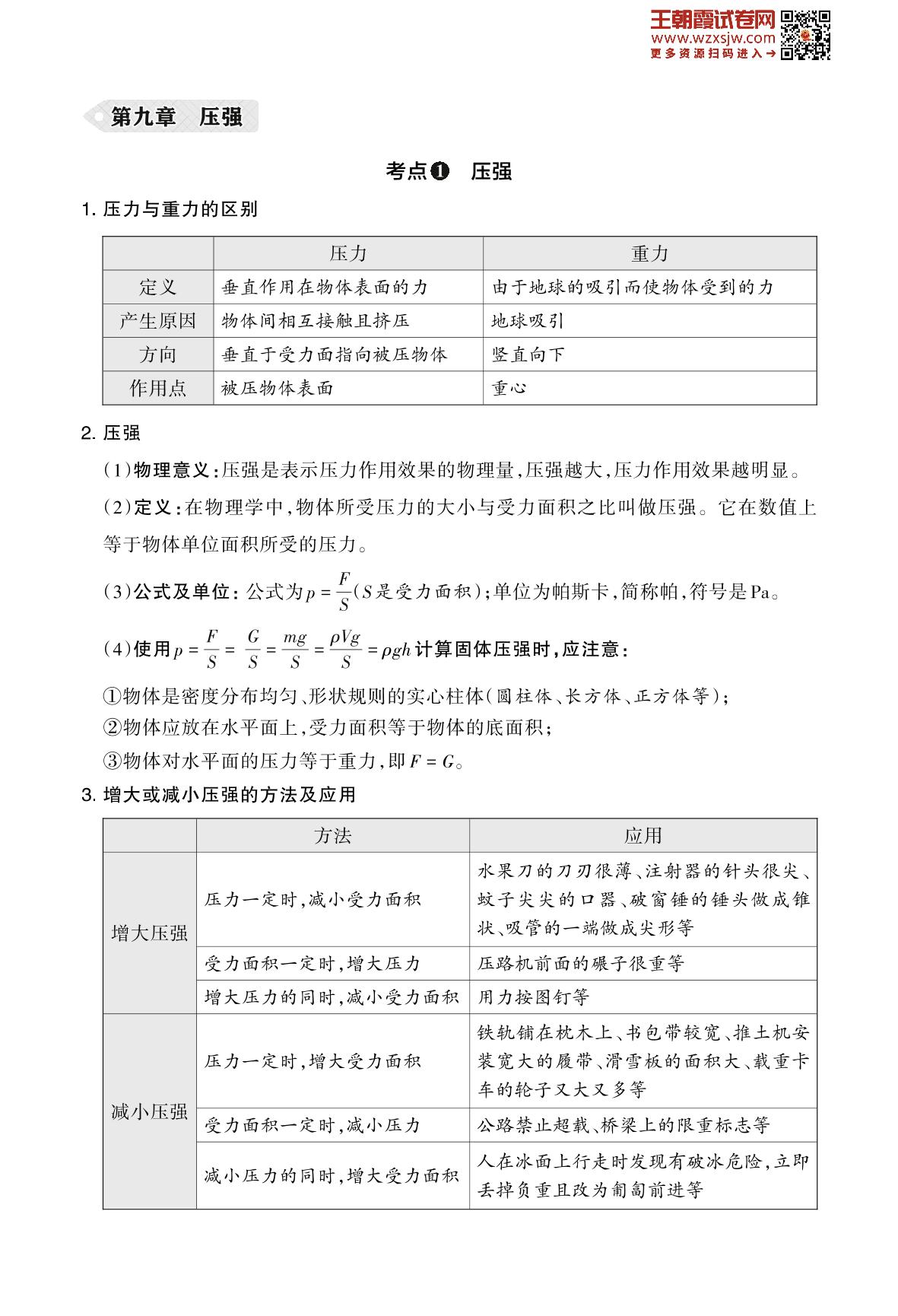 2023下册八年级物理人教版 基础知识梳理——第九章 压强