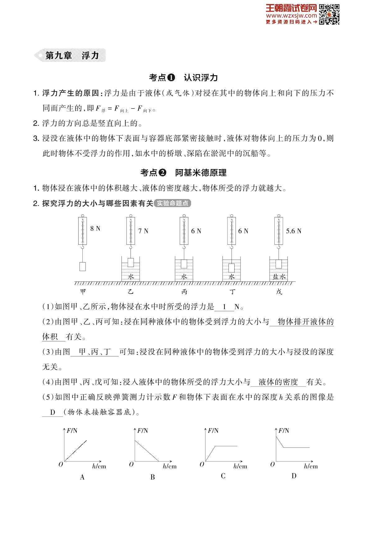 2023下册八年级物理沪科版 基础知识梳理——第九章 浮力