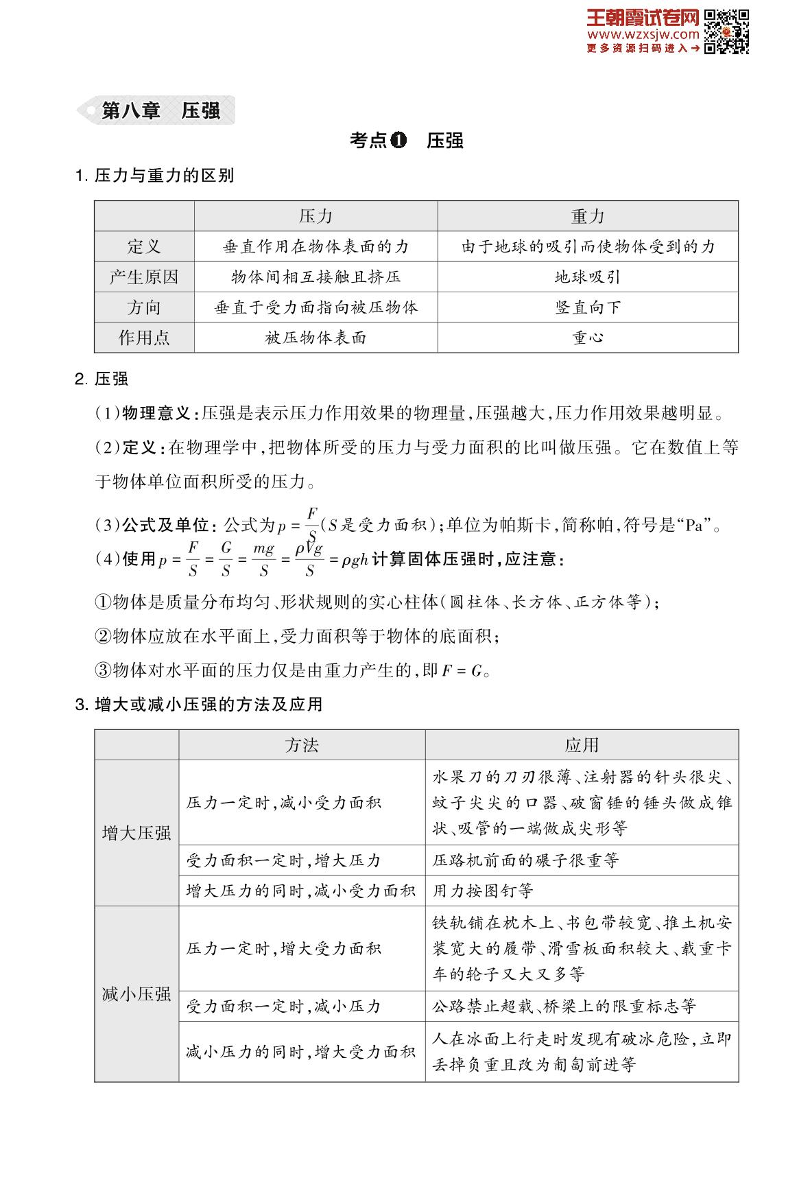 2023下册八年级物理沪科版 基础知识梳理——第八章 压强
