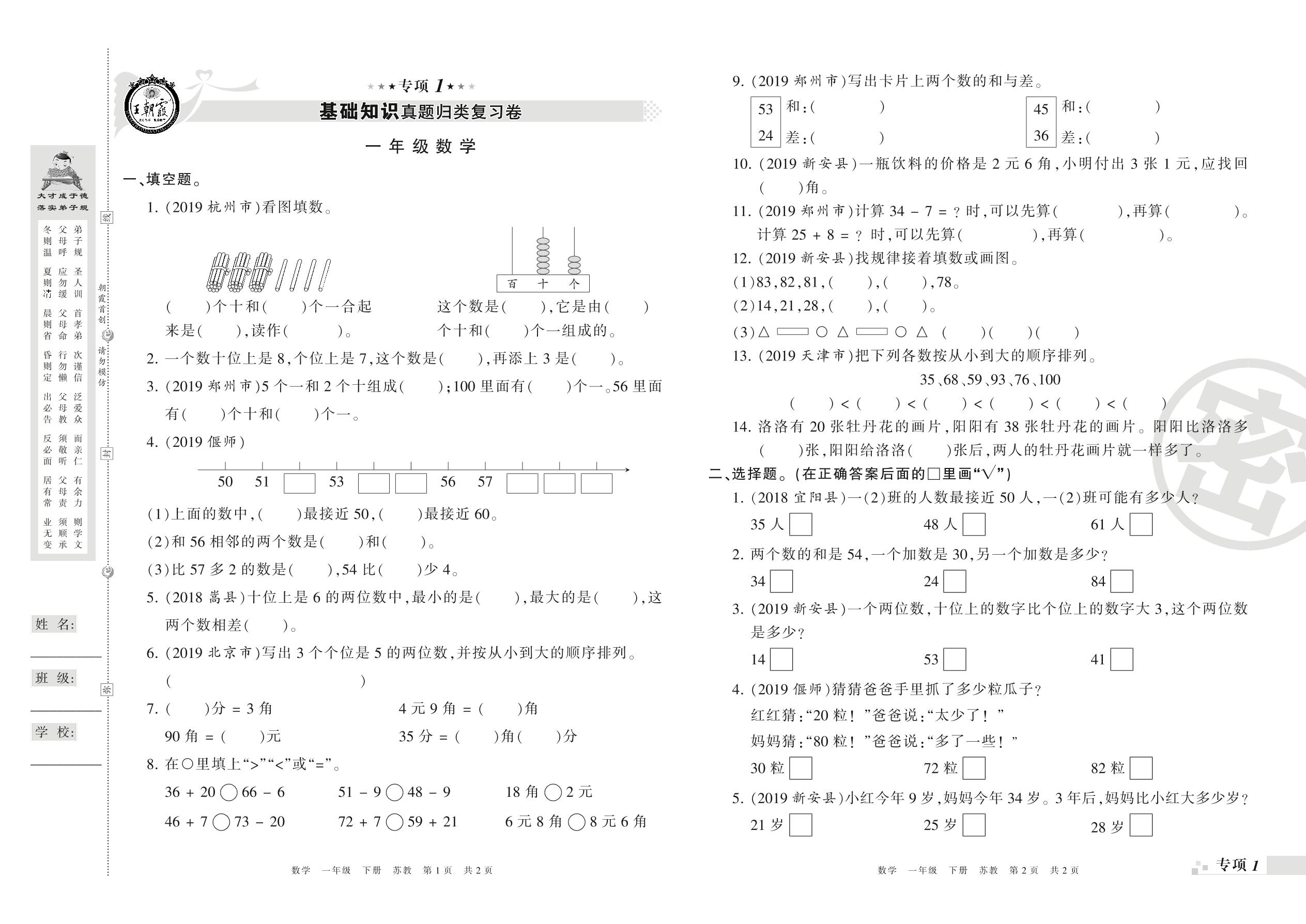 王朝霞期末专项卷——基础知识、计算真题归类复习卷一年级下册数学(苏教版)_R210802213634【0】