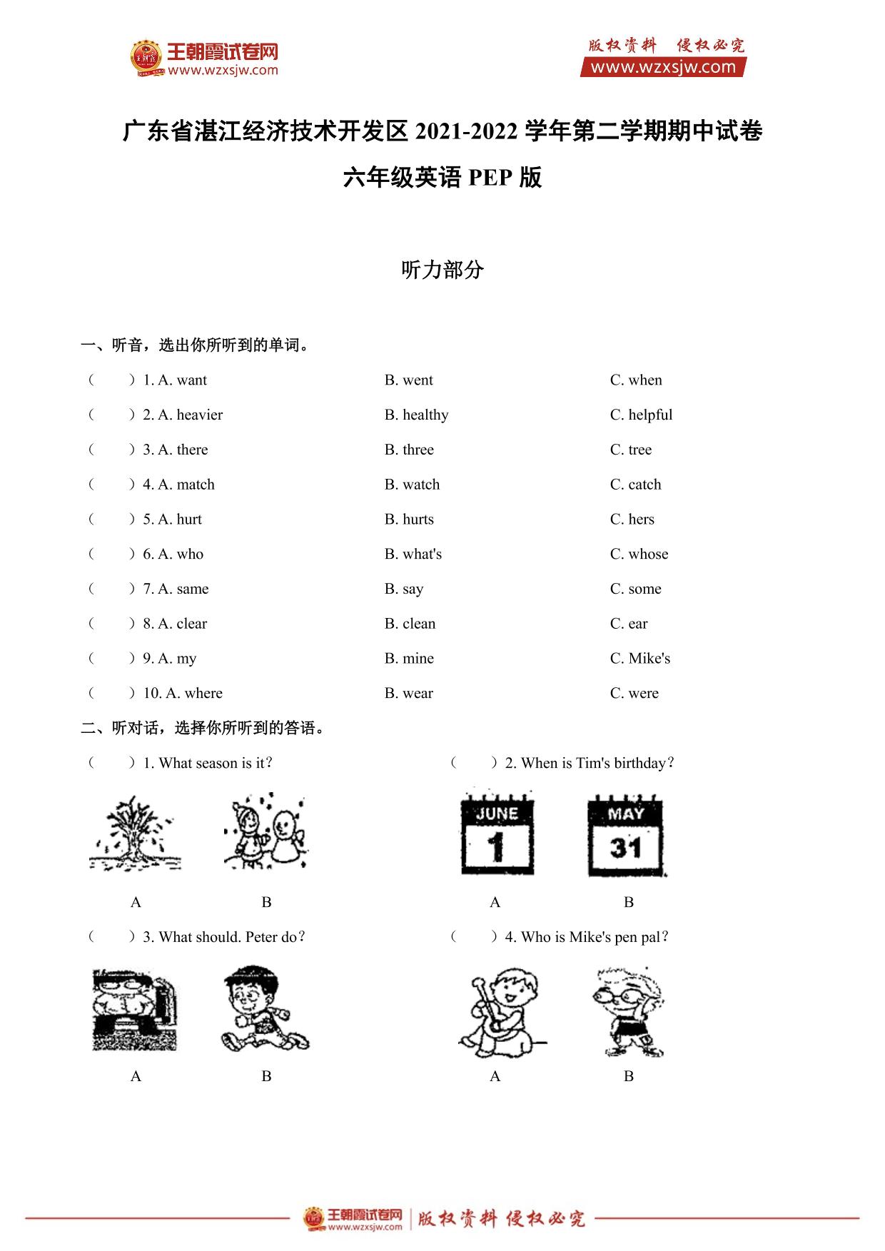 广东省湛江经济技术开发区2021-2022学年第二学期期中试卷六年级英语(PEP版)【无听力音频】