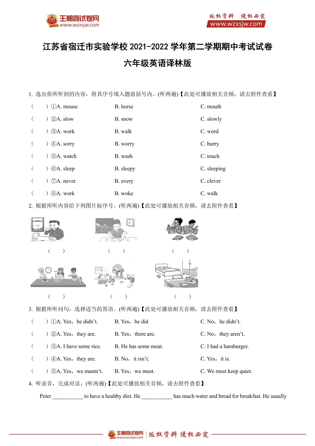 江苏省宿迁市实验学校2021-2022学年第二学期期中考试试卷六年级英语(译林版)【无听力音频】