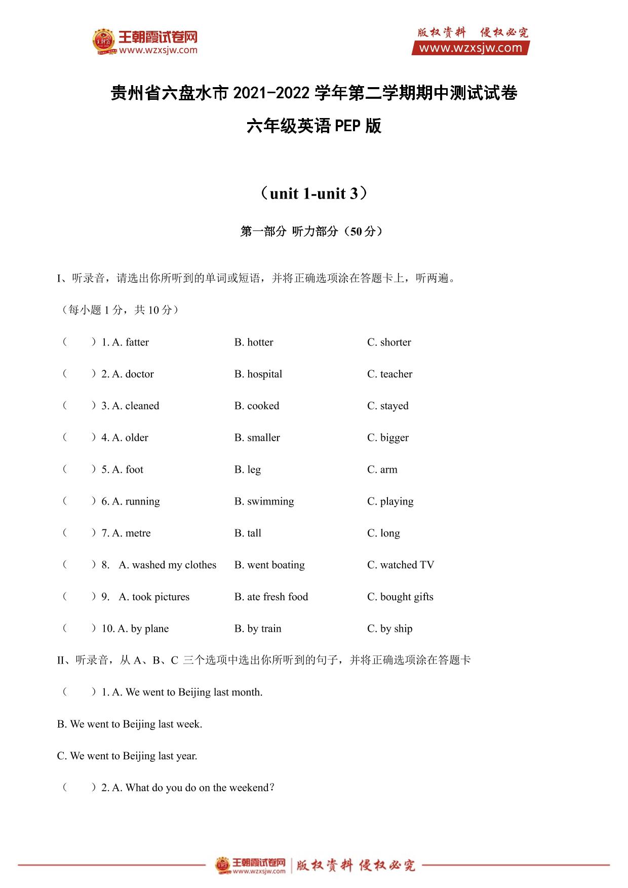 贵州省六盘水市2021-2022学年第二学期期中测试试卷六年级英语(PEP版)【无听力音频】