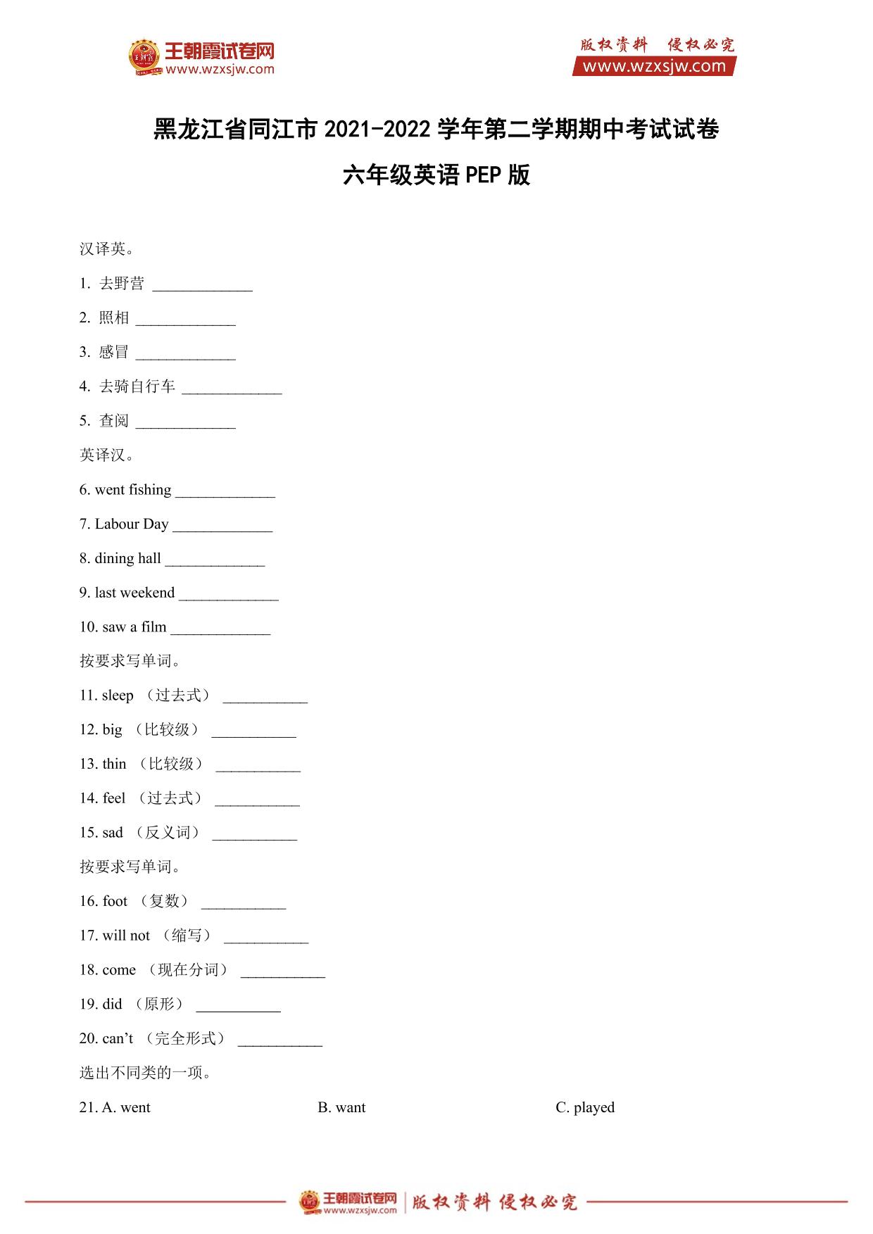 黑龙江省同江市2021-2022学年第二学期期中考试试卷六年级英语(PEP版)【无听力音频】