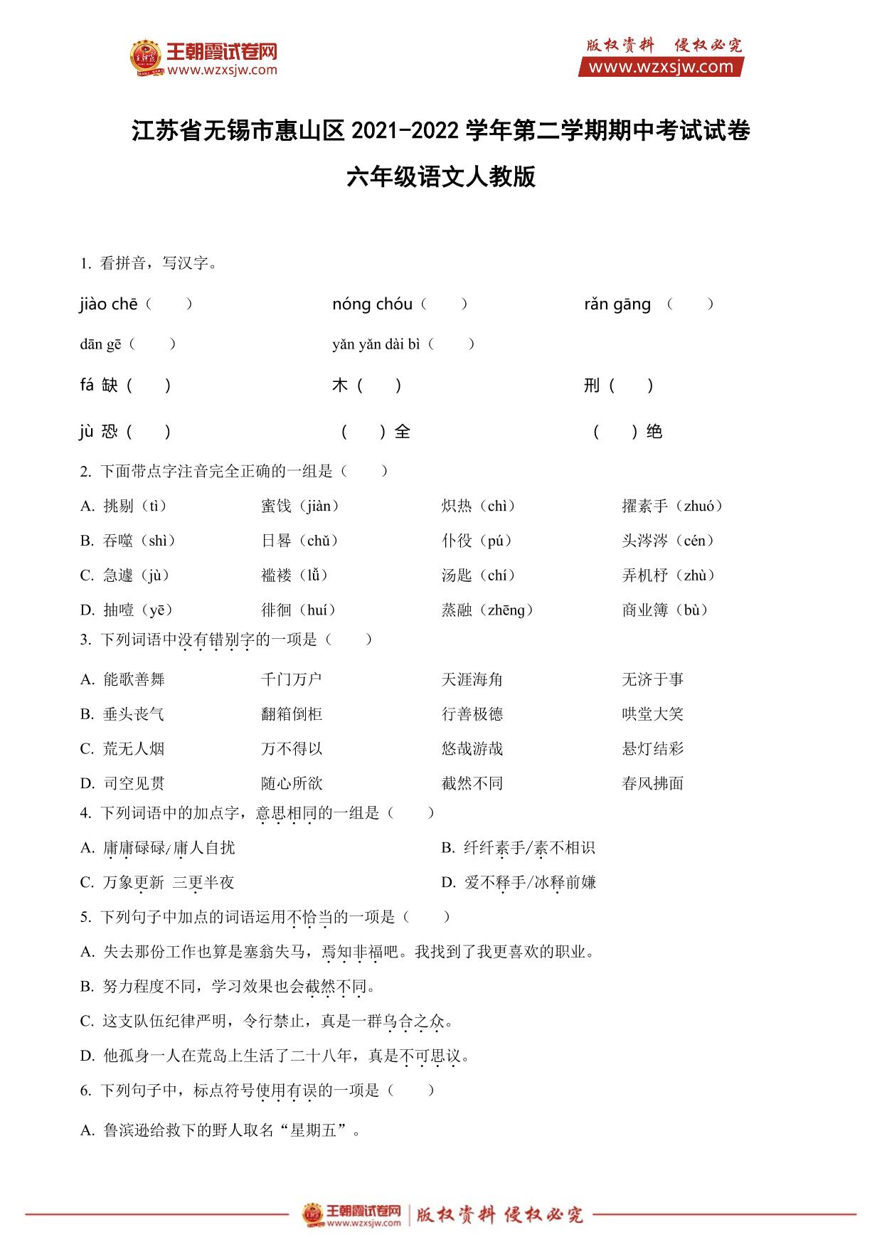 江苏省无锡市惠山区2021-2022学年第二学期期中考试试卷六年级语文(人教版)