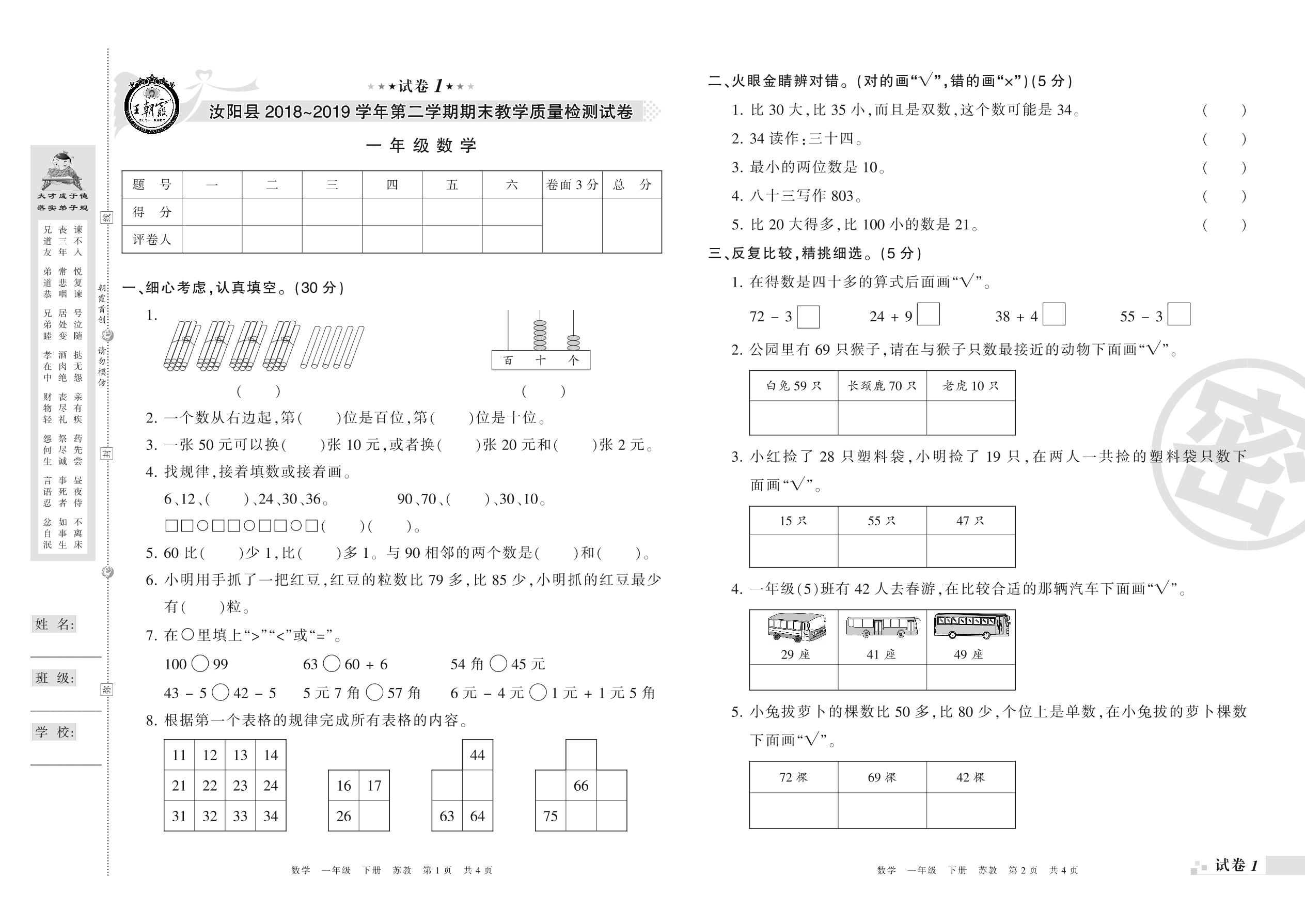 2018-2019学年第二学期洛阳市汝阳县一年级数学试卷(苏教版)【1】