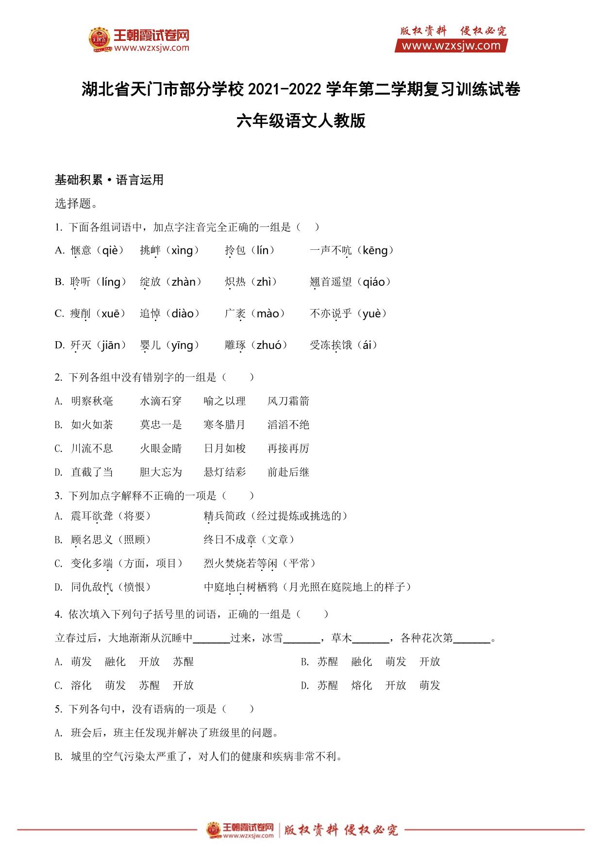 湖北省天门市部分学校2021-2022学年第二学期复习训练试卷六年级语文(人教版)
