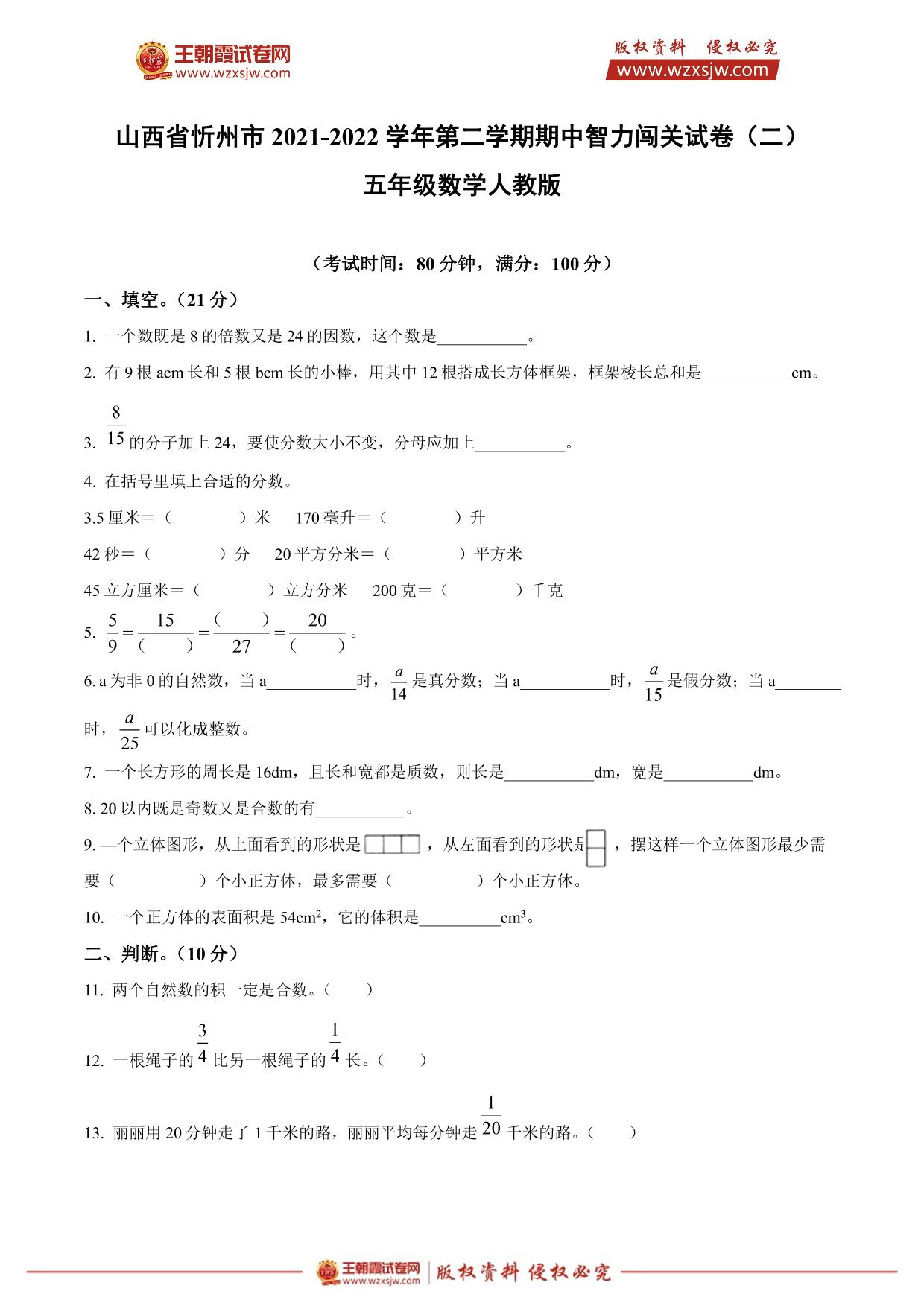 山西省忻州市2021-2022学年第二学期期中智力闯关试卷(二)五年级数学(人教版)