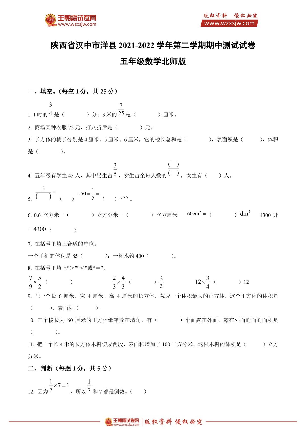 陕西省汉中市洋县2021-2022学年第二学期期中测试试卷五年级数学(北师版)
