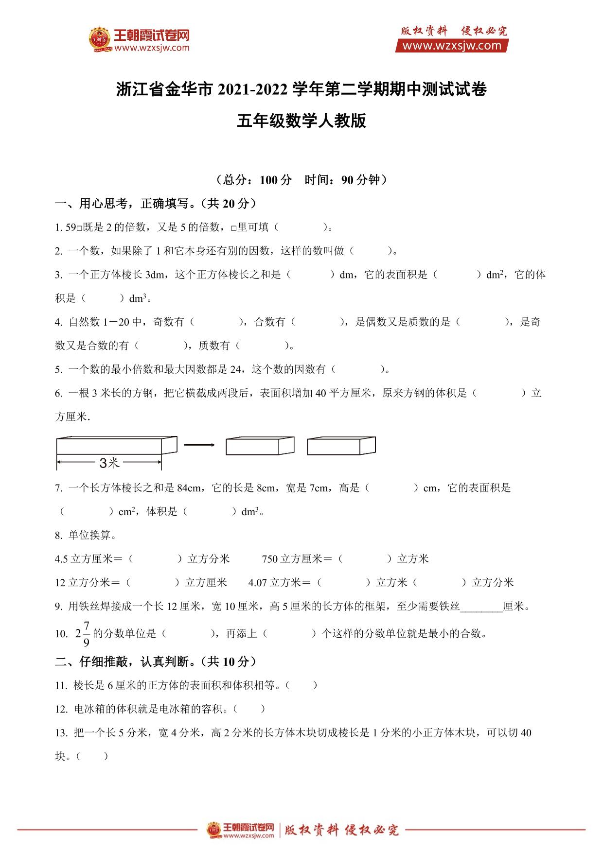 浙江省金华市2021-2022学年第二学期期中测试试卷五年级数学(人教版)
