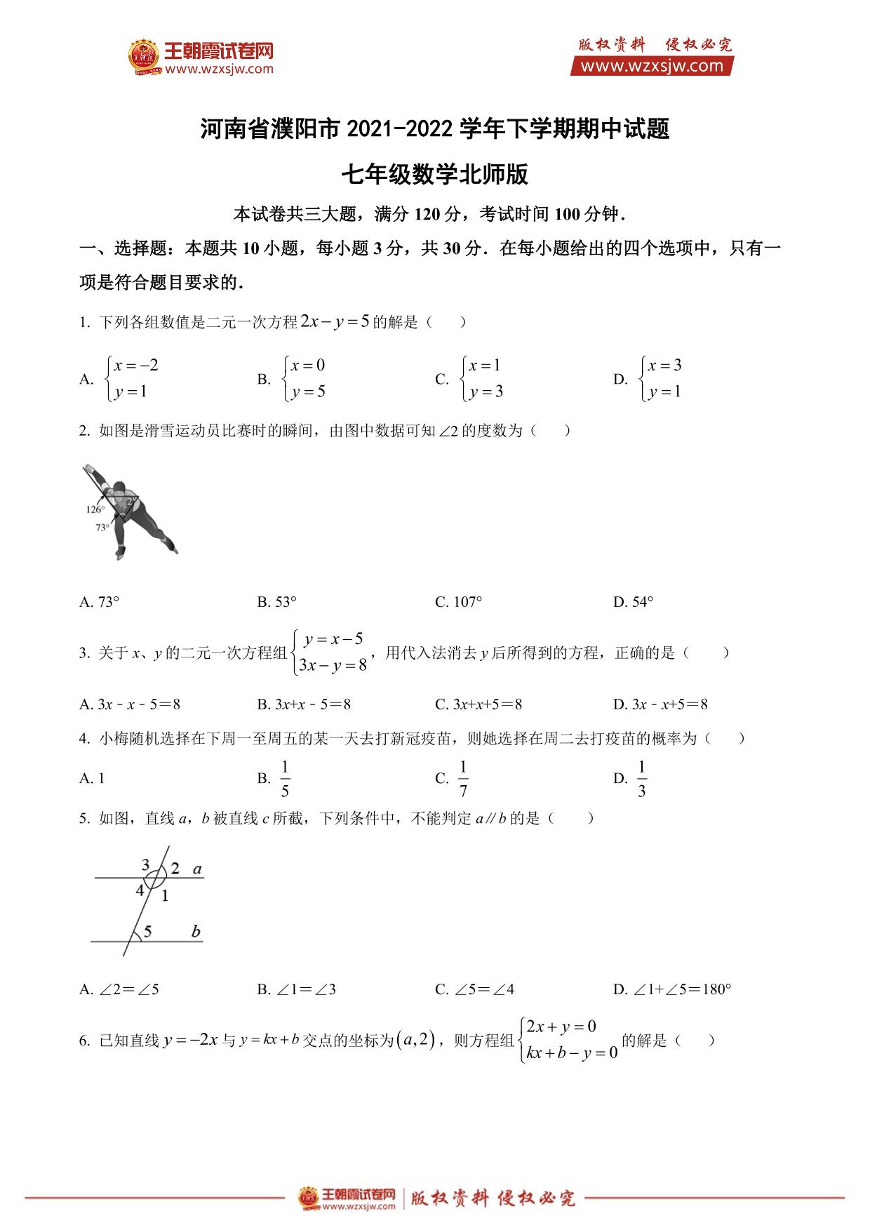 河南省濮阳市2021-2022学年下学期期中试题七年级数学(北师版)