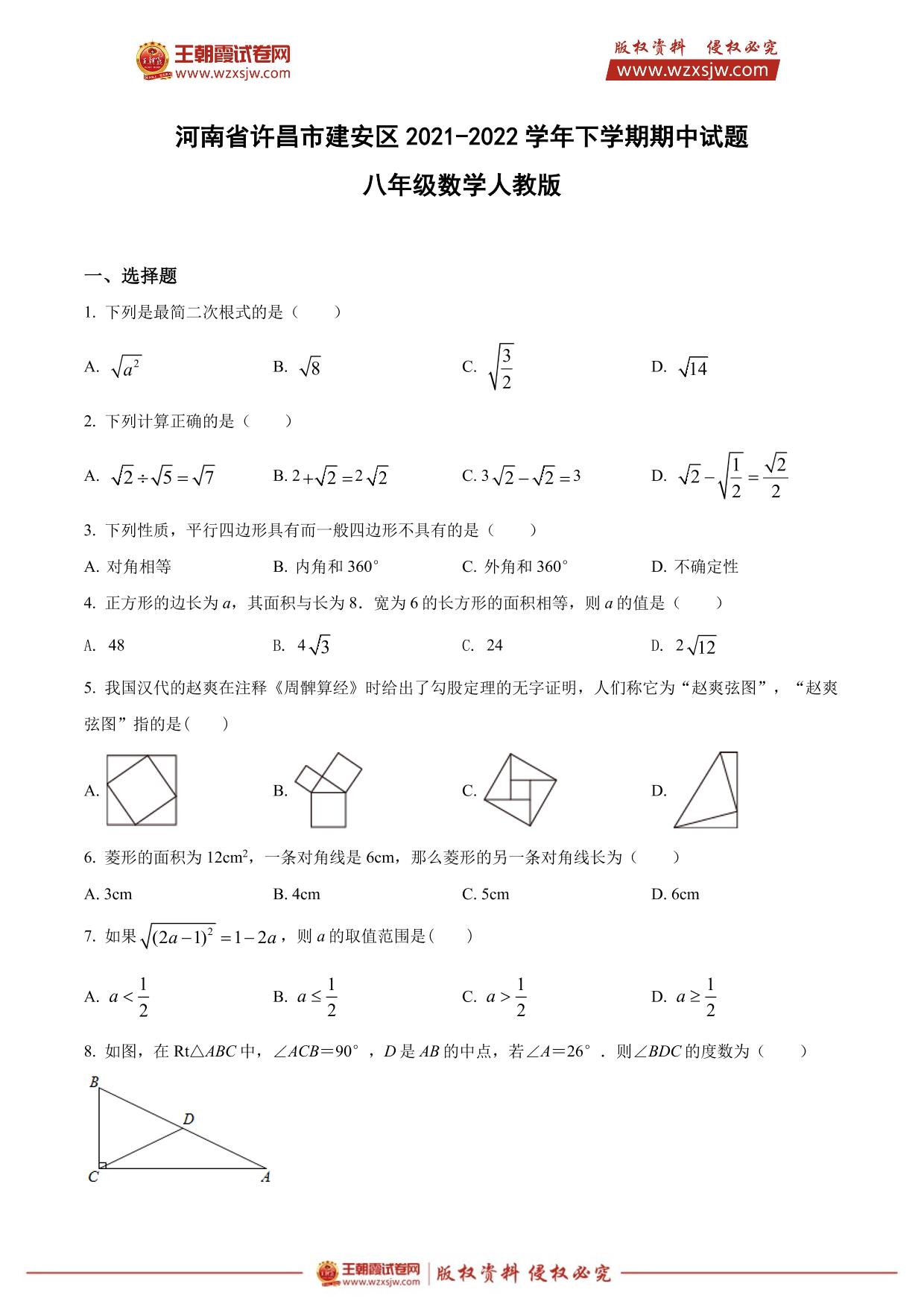 河南省许昌市建安区2021-2022学年下学期期中试题八年级数学(人教版)