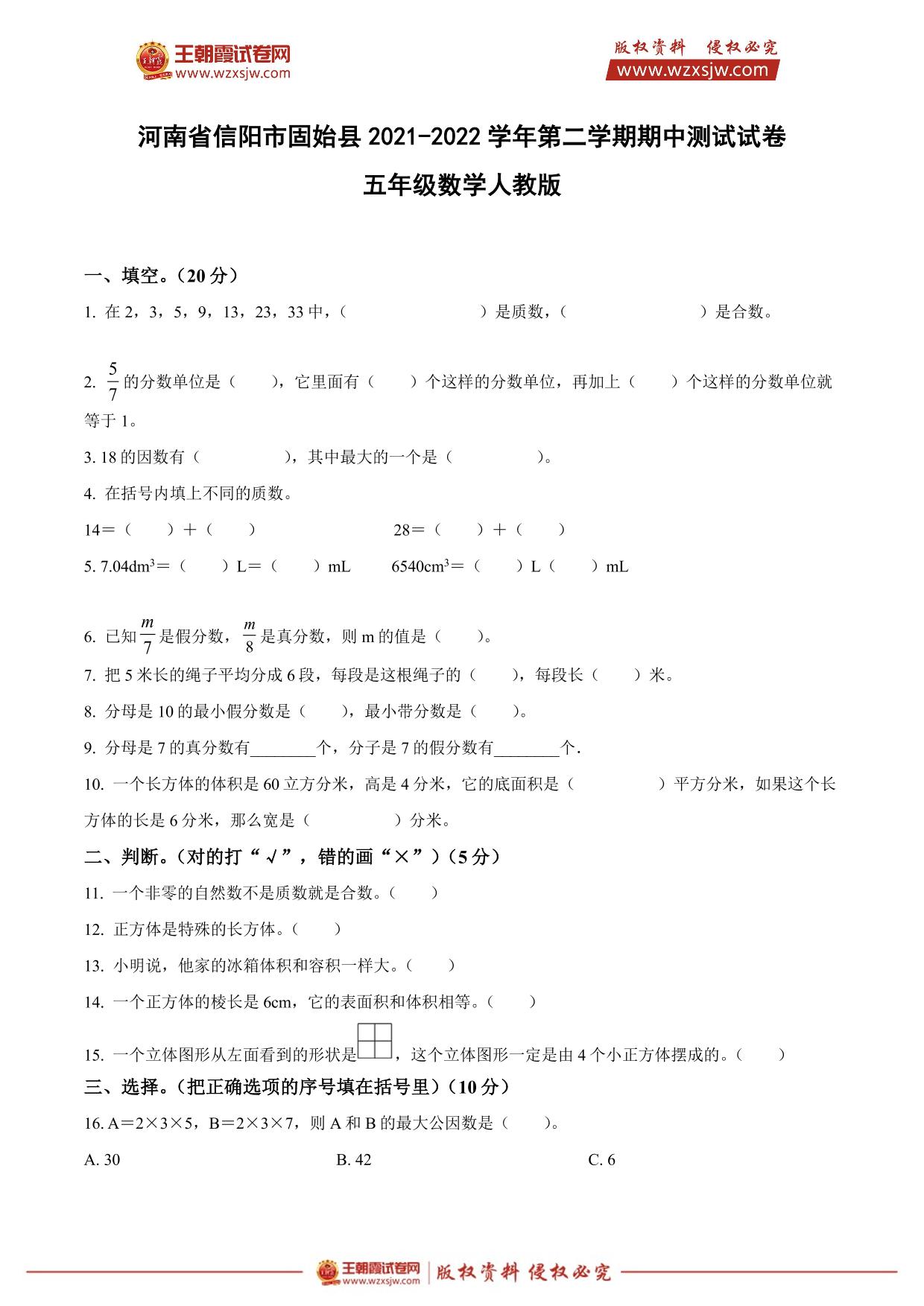 河南省信阳市固始县2021-2022学年第二学期期中测试试卷五年级数学(人教版)