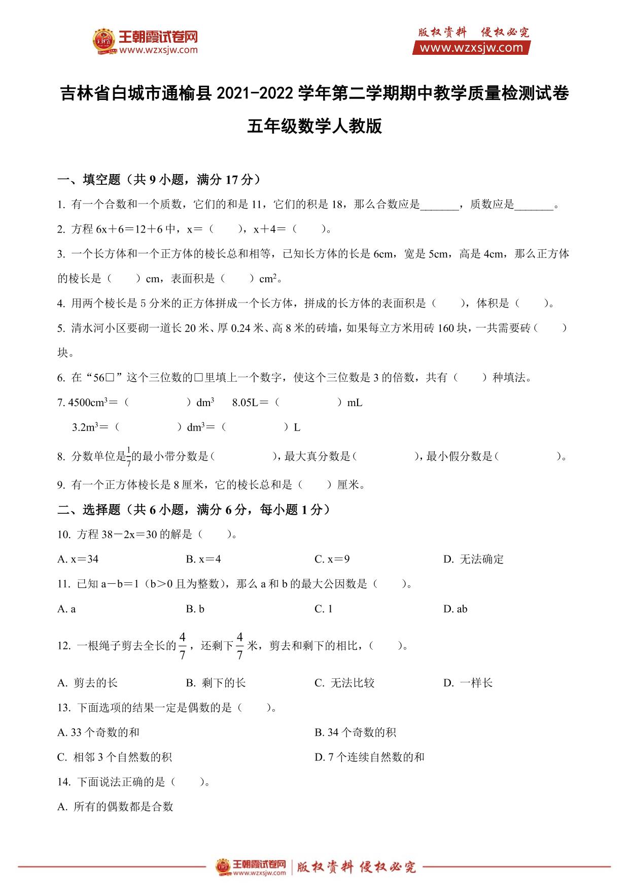 吉林省白城市通榆县2021-2022学年第二学期期中教学质量检测试卷五年级数学(人教版)