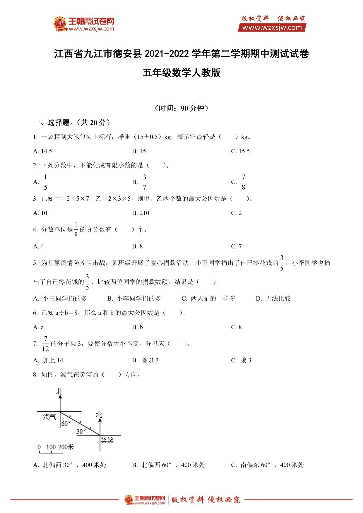 江西省九江市德安县2021-2022学年第二学期期中测试试卷五年级数学(人教版)
