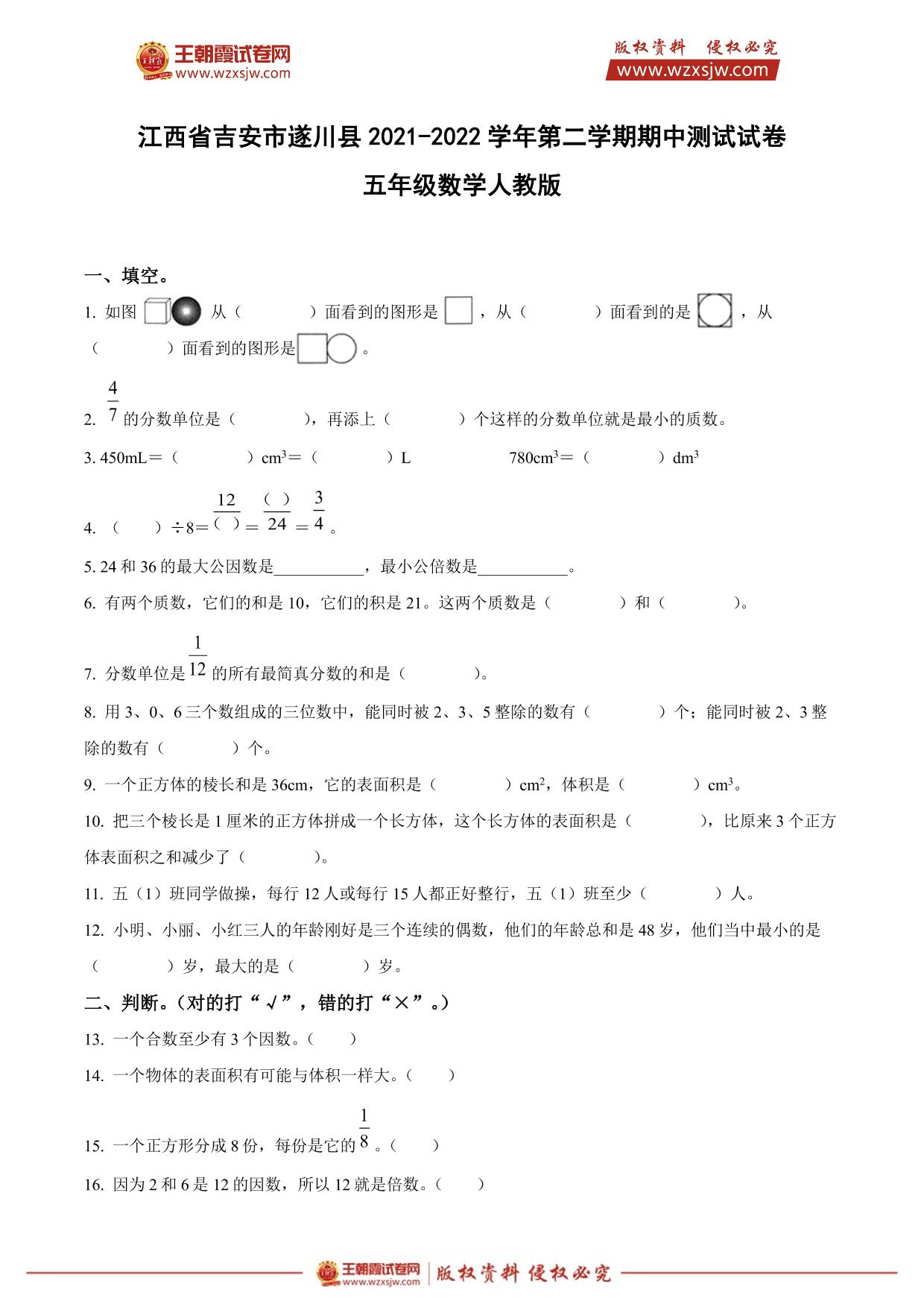 江西省吉安市遂川县2021-2022学年第二学期期中测试试卷五年级数学(人教版)