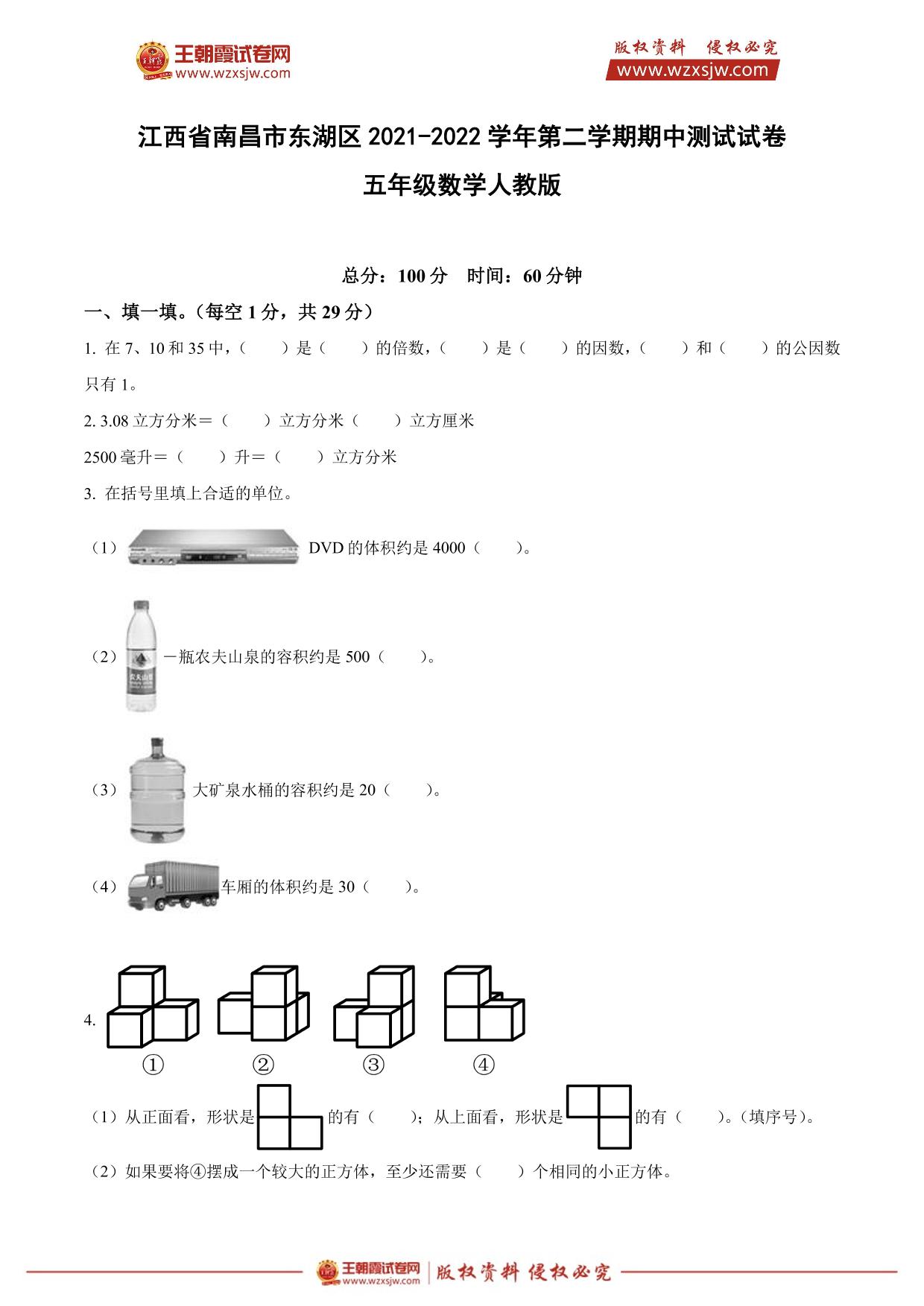 江西省南昌市东湖区2021-2022学年第二学期期中测试试卷五年级数学(人教版)