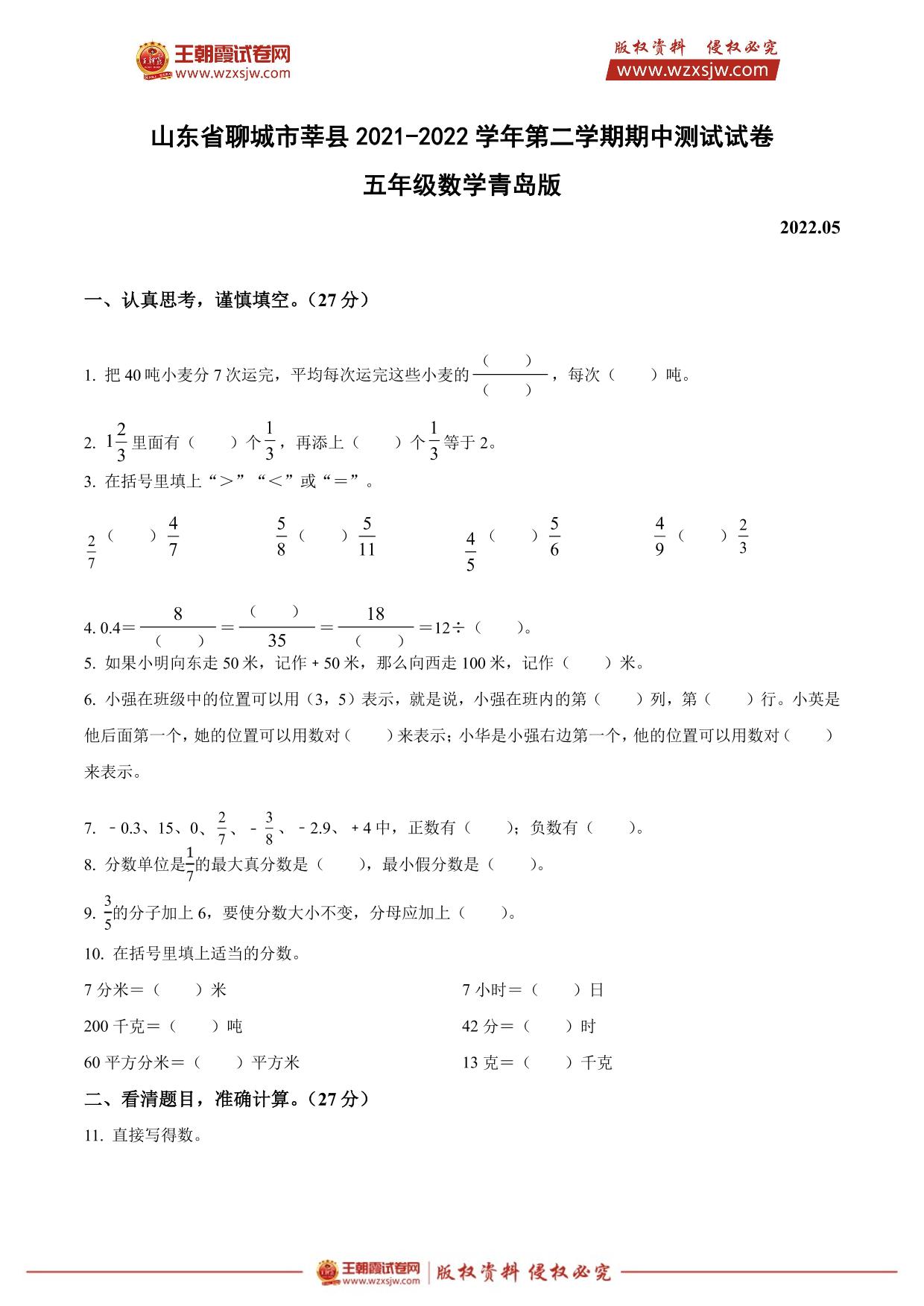 山东省聊城市莘县2021-2022学年第二学期期中测试试卷五年级数学(青岛版)