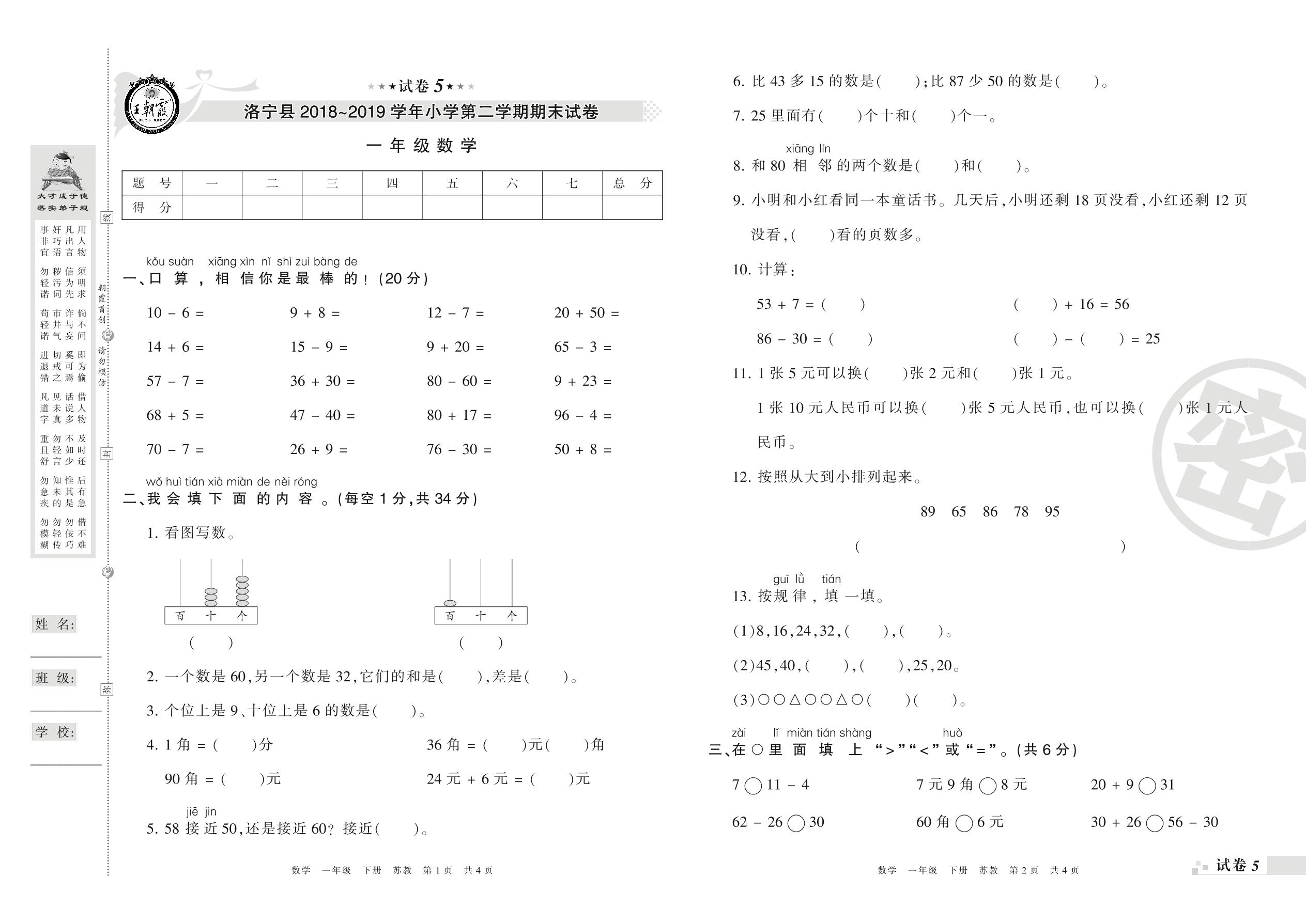 2018-2019学年第二学期洛阳市洛宁县一年级数学试卷(苏教版)【5】