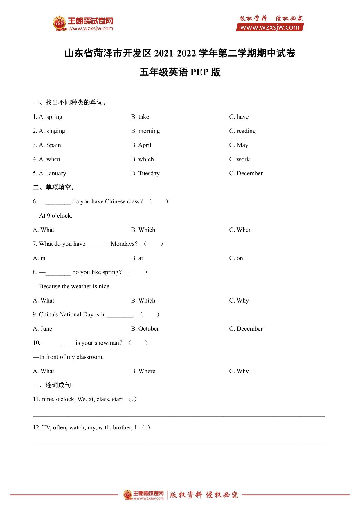 山东省菏泽市开发区2021-2022学年第二学期期中试卷五年级英语(PEP版)【无听力音频】