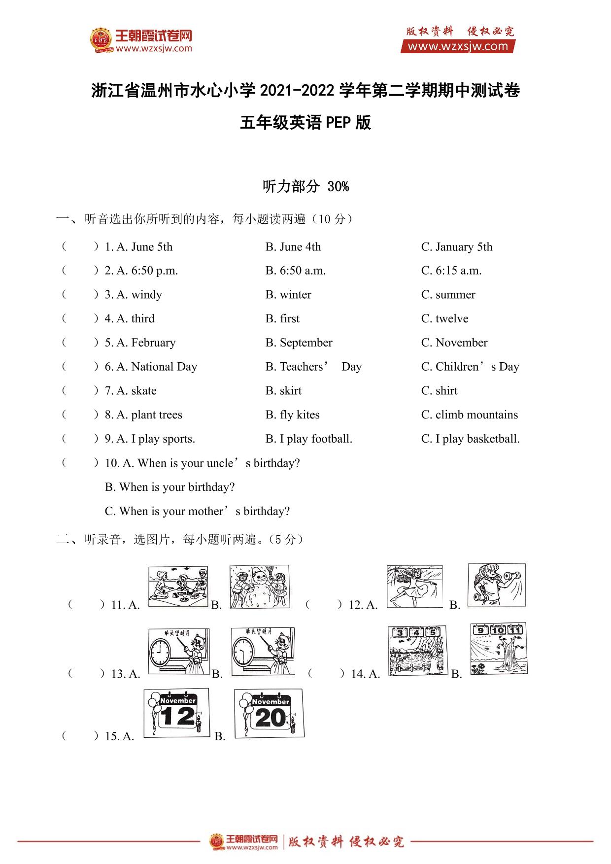 浙江省温州市水心小学2021-2022学年第二学期期中测试试卷五年级英语(PEP版)【无听力音频】