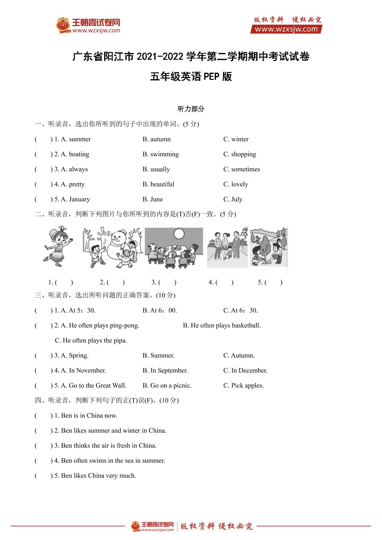 广东省阳江市2021-2022学年第二学期期中考试试卷五年级英语(PEP版)【无听力音频】