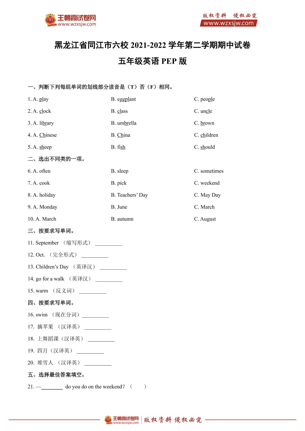 黑龙江省同江市六校2021-2022学年第二学期期中试卷五年级英语(PEP版)【无听力音频】