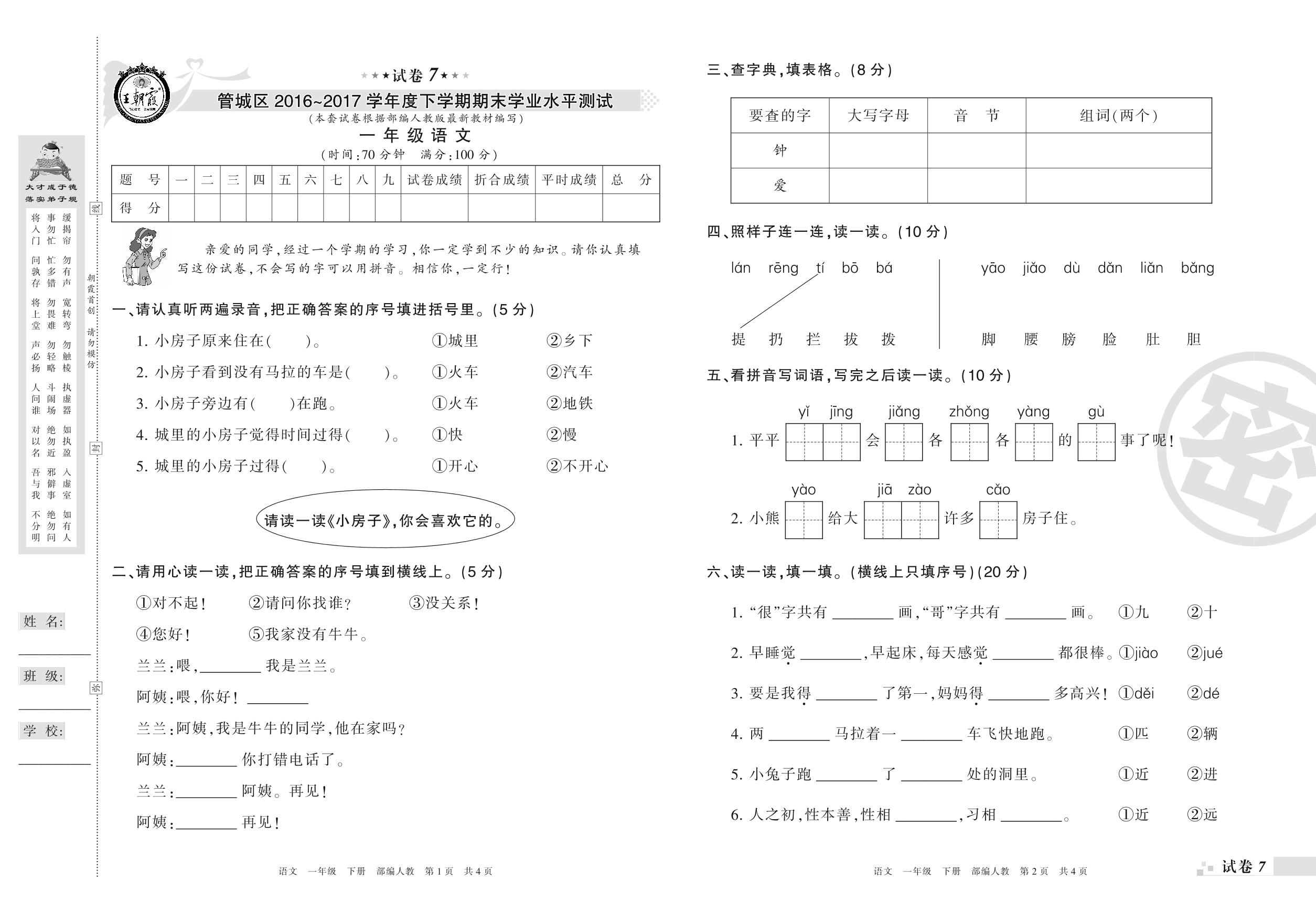 2016-2017学年第二学期郑州市管城区一年级语文试卷(人教版)【7】
