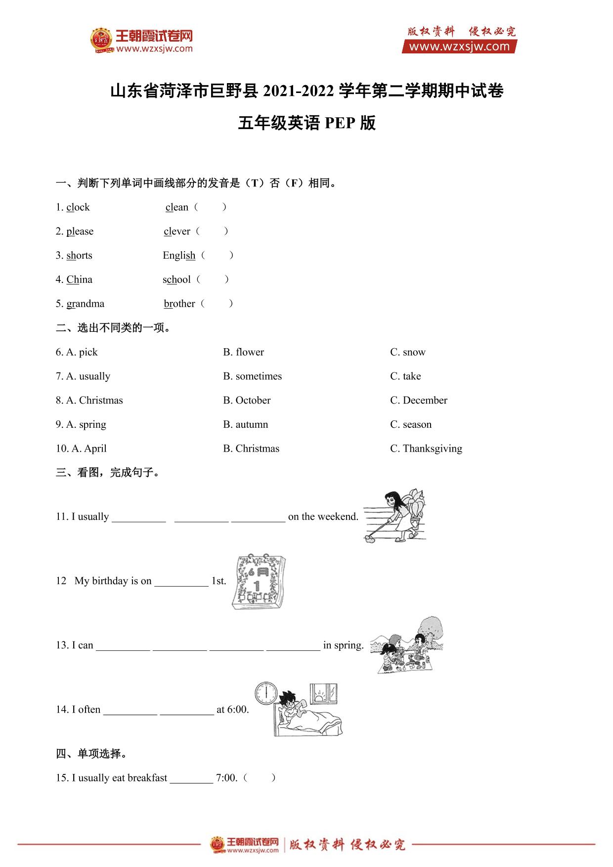 山东省菏泽市巨野县2021-2022学年第二学期期中试卷五年级英语(PEP版)【无听力音频】