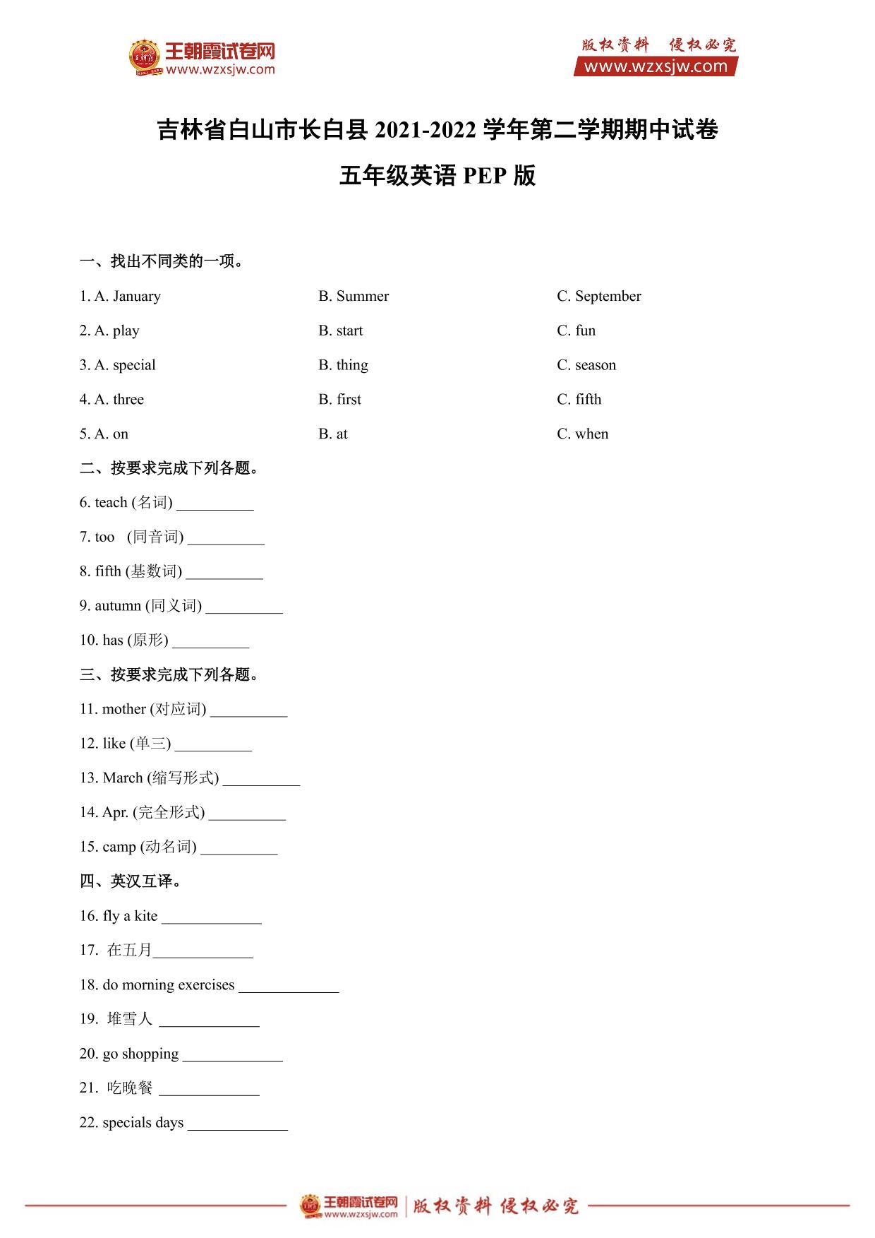 吉林省白山市长白县2021-2022学年第二学期期中试卷五年级英语(PEP版)【无听力音频】
