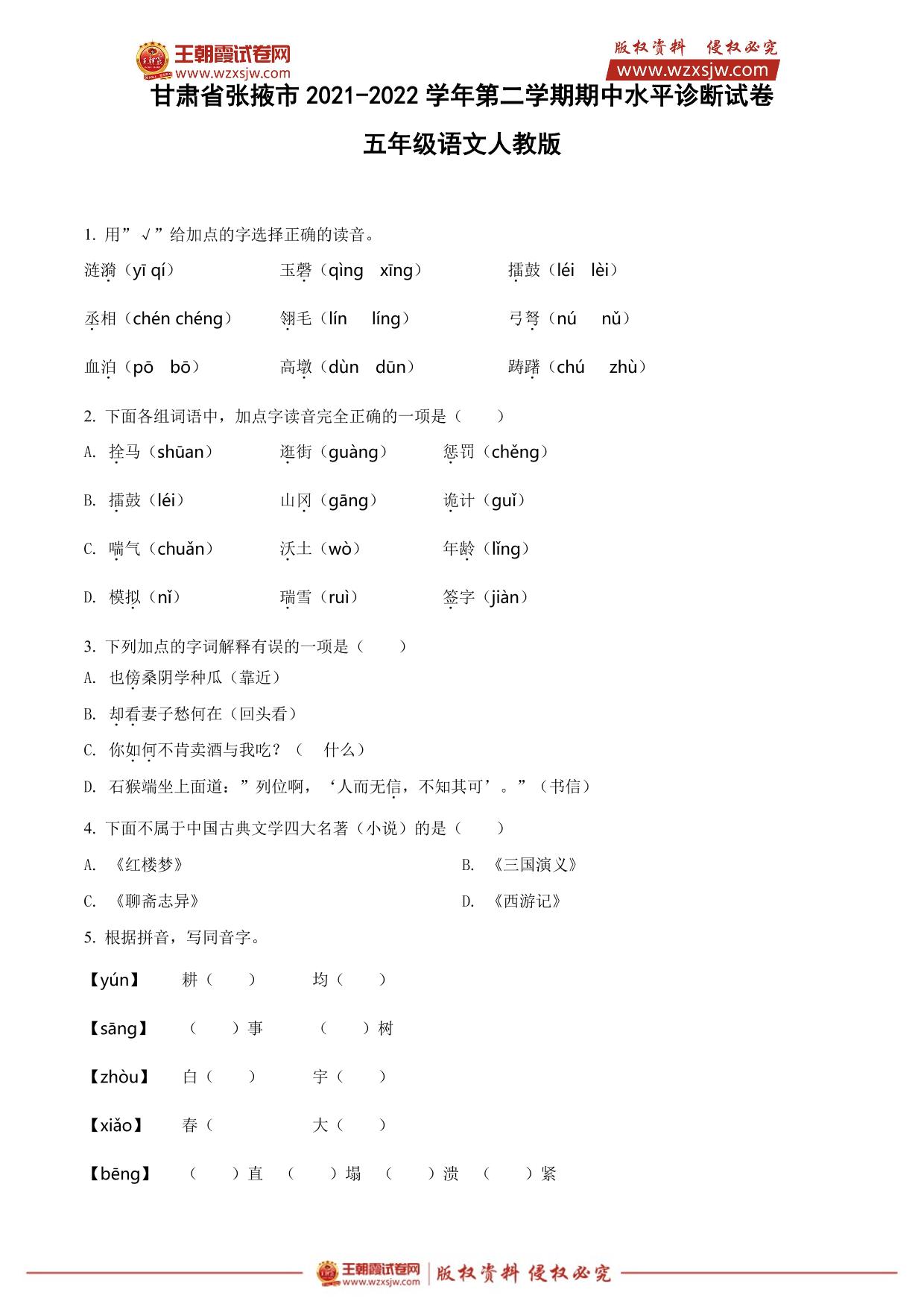 甘肃省张掖市2021-2022学年第二学期期中水平诊断试卷五年级语文(人教版)