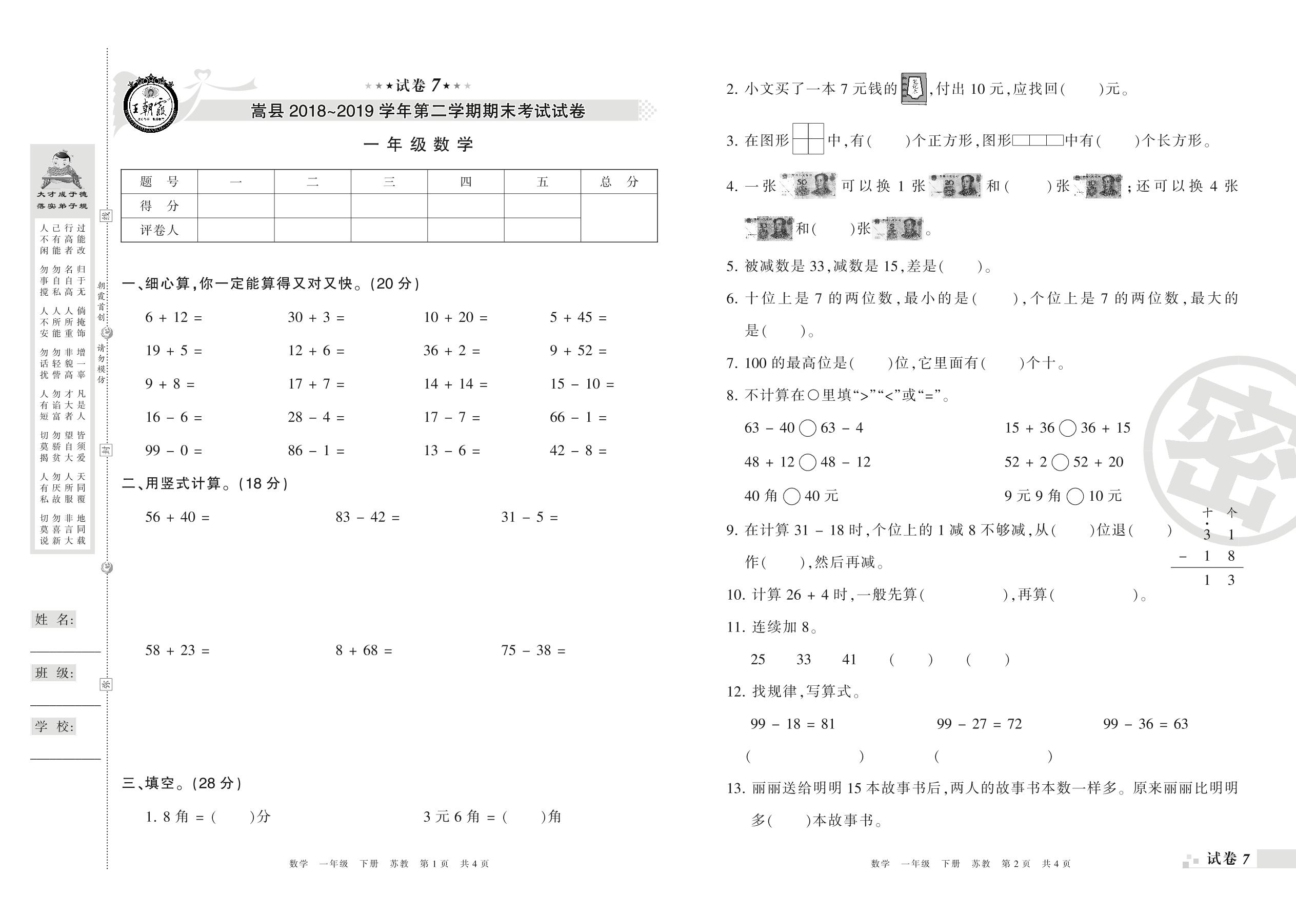 2018-2019学年第二学期洛阳市嵩县一年级数学试卷(苏教版)【7】