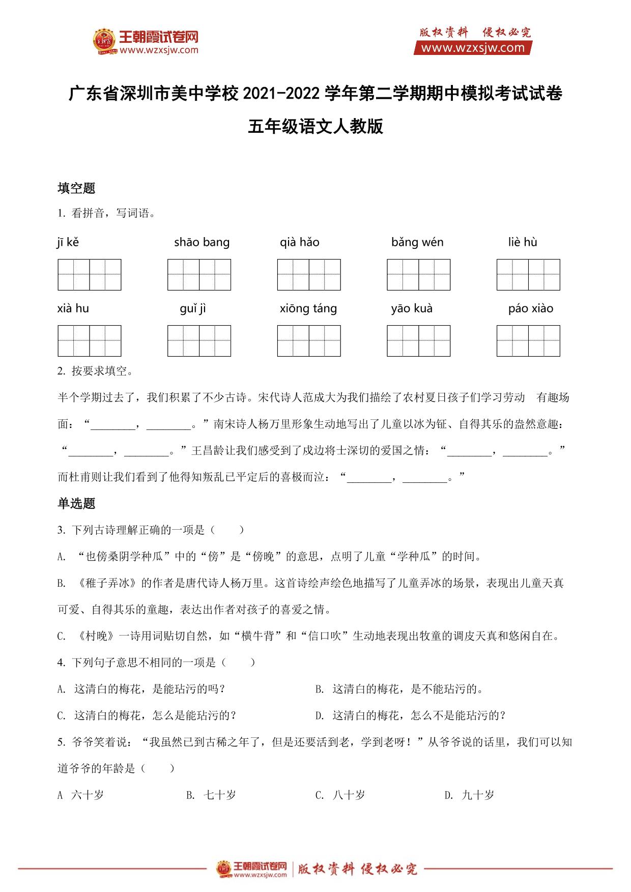 广东省深圳市美中学校2021-2022学年第二学期期中模拟考试试卷五年级语文(人教版)