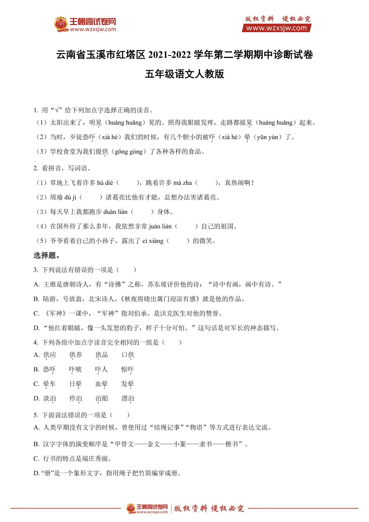 云南省玉溪市红塔区2021-2022学年第二学期期中诊断试卷五年级语文(人教版)