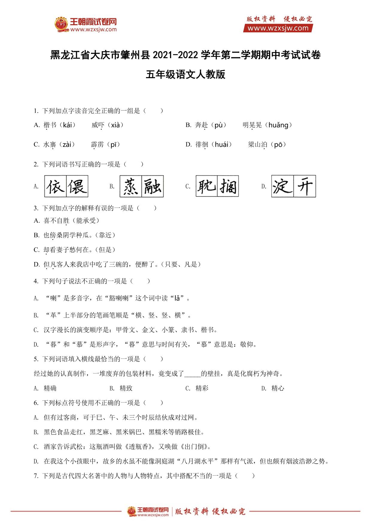 黑龙江省大庆市肇州县2021-2022学年第二学期期中考试试卷五年级语文(人教版)