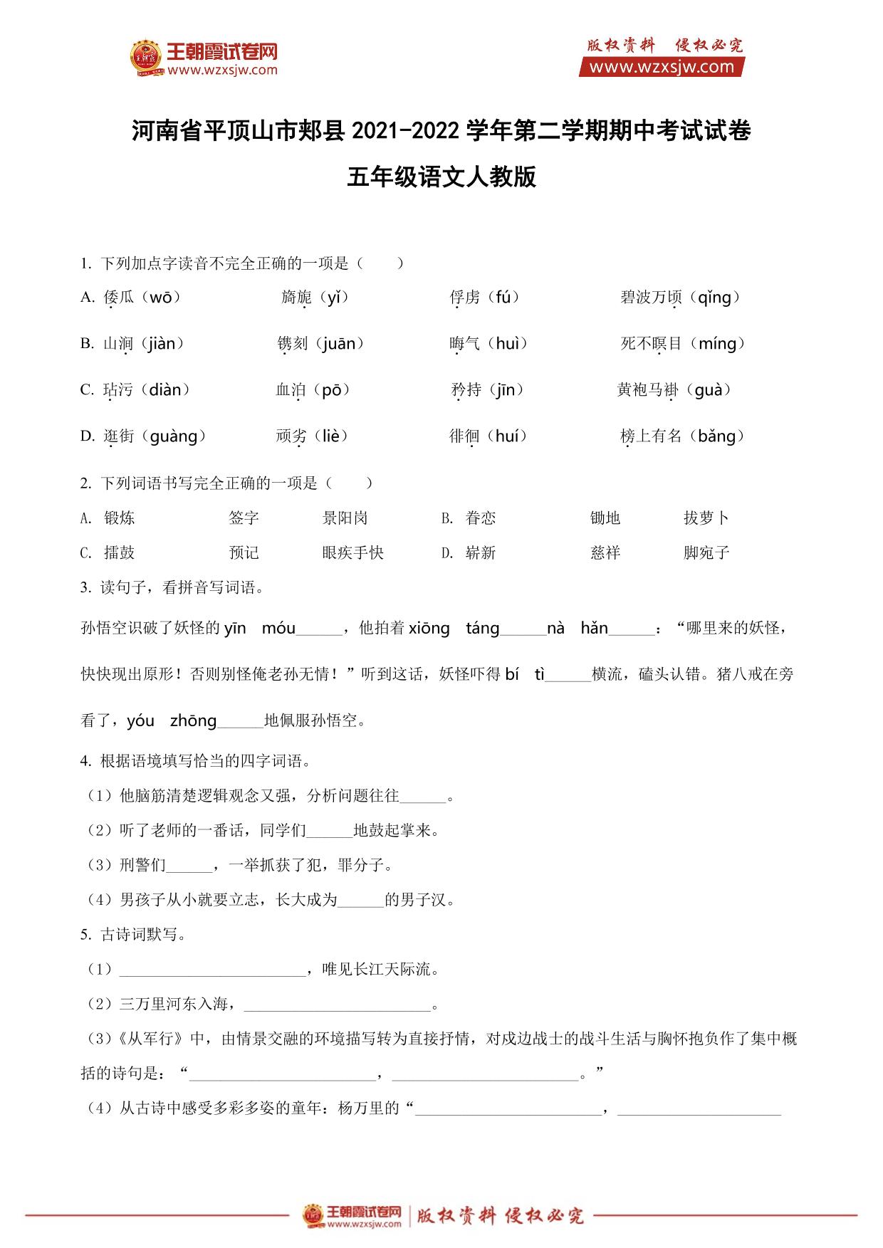 河南省平顶山市郏县2021-2022学年第二学期期中考试试卷五年级语文(人教版)