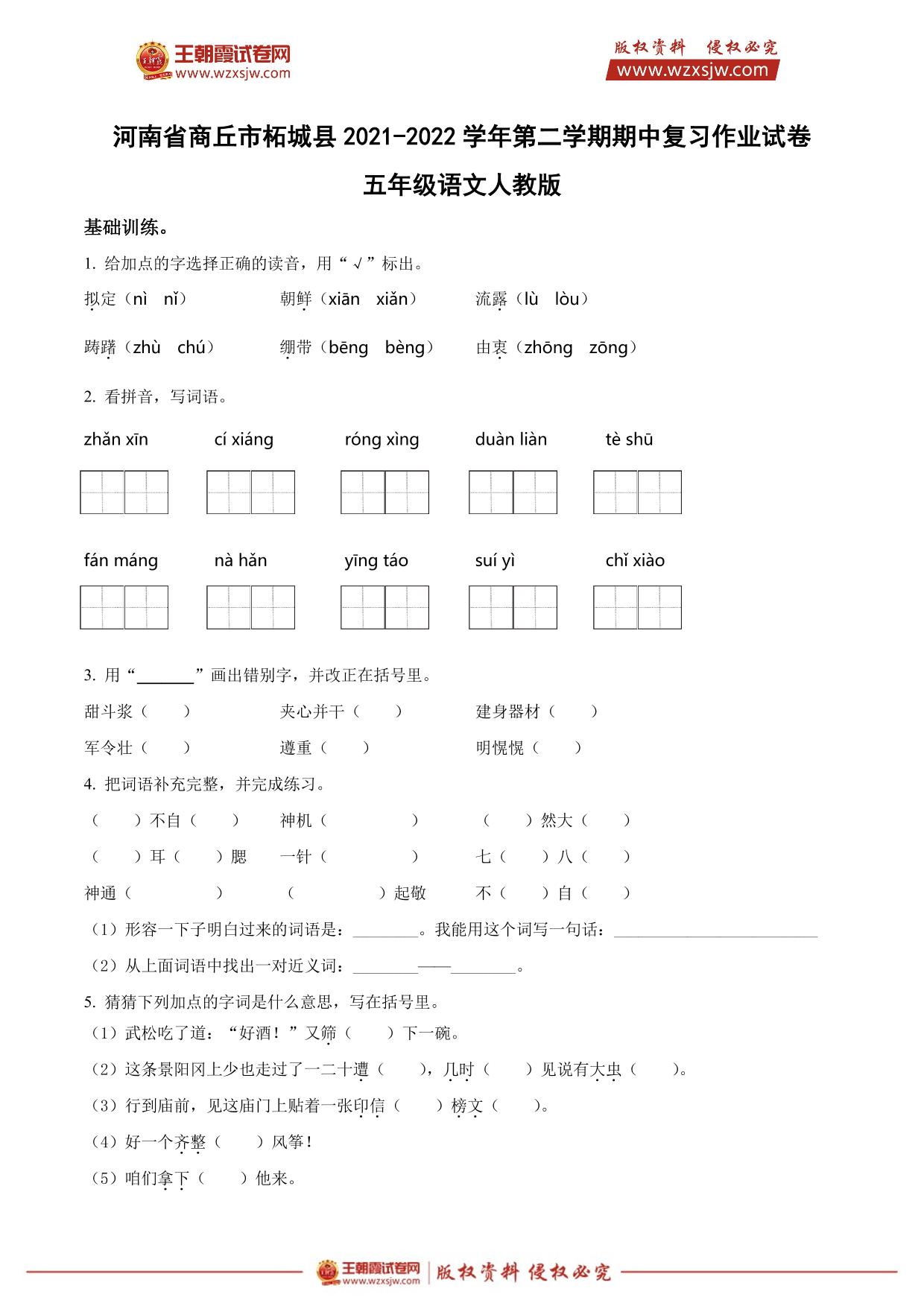 河南省商丘市柘城县2021-2022学年第二学期期中复习作业试卷五年级语文(人教版)
