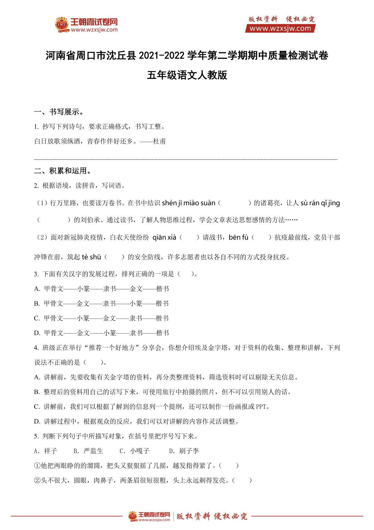 河南省周口市沈丘县2021-2022学年第二学期期中质量检测试卷五年级语文(人教版)
