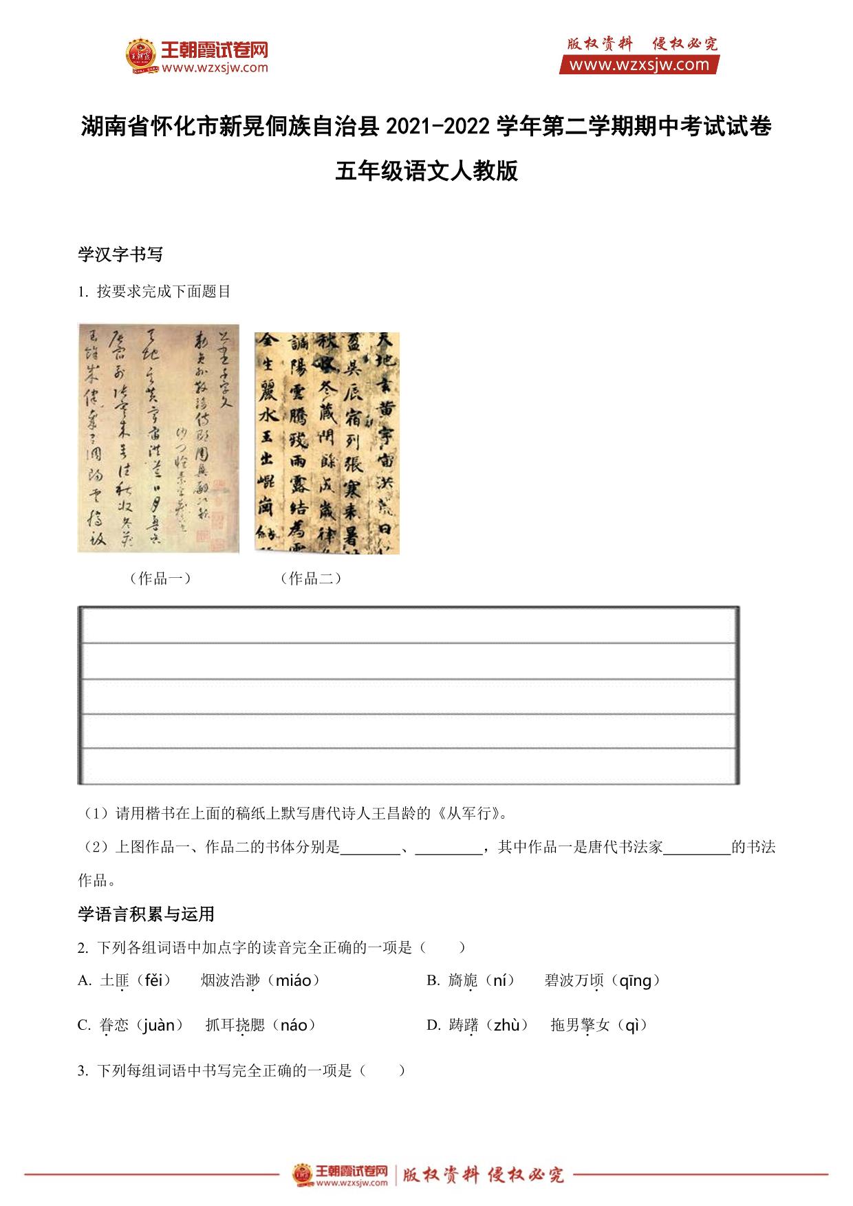 湖南省怀化市新晃侗族自治县2021-2022学年第二学期期中考试试卷五年级语文(人教版)