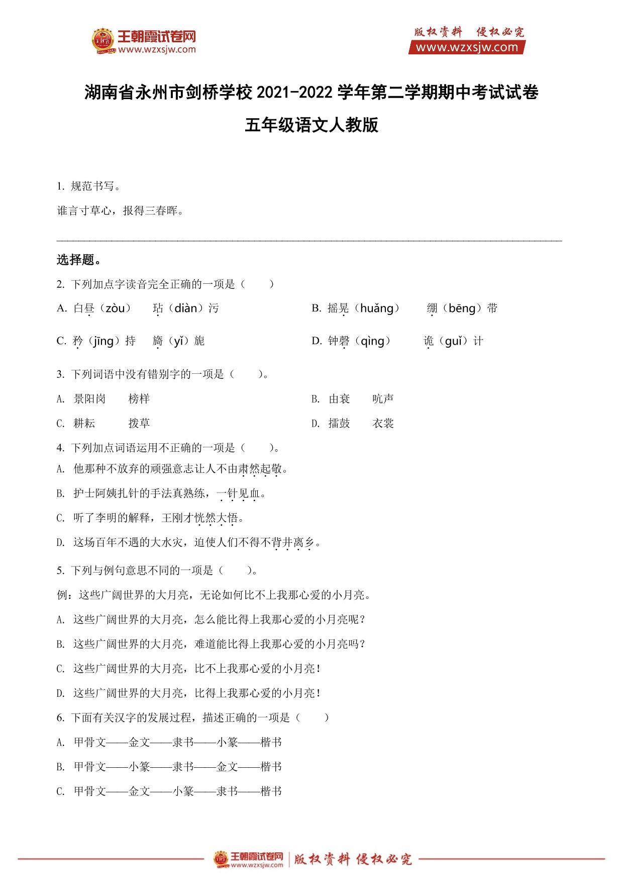 湖南省永州市剑桥学校2021-2022学年第二学期期中考试试卷五年级语文(人教版)