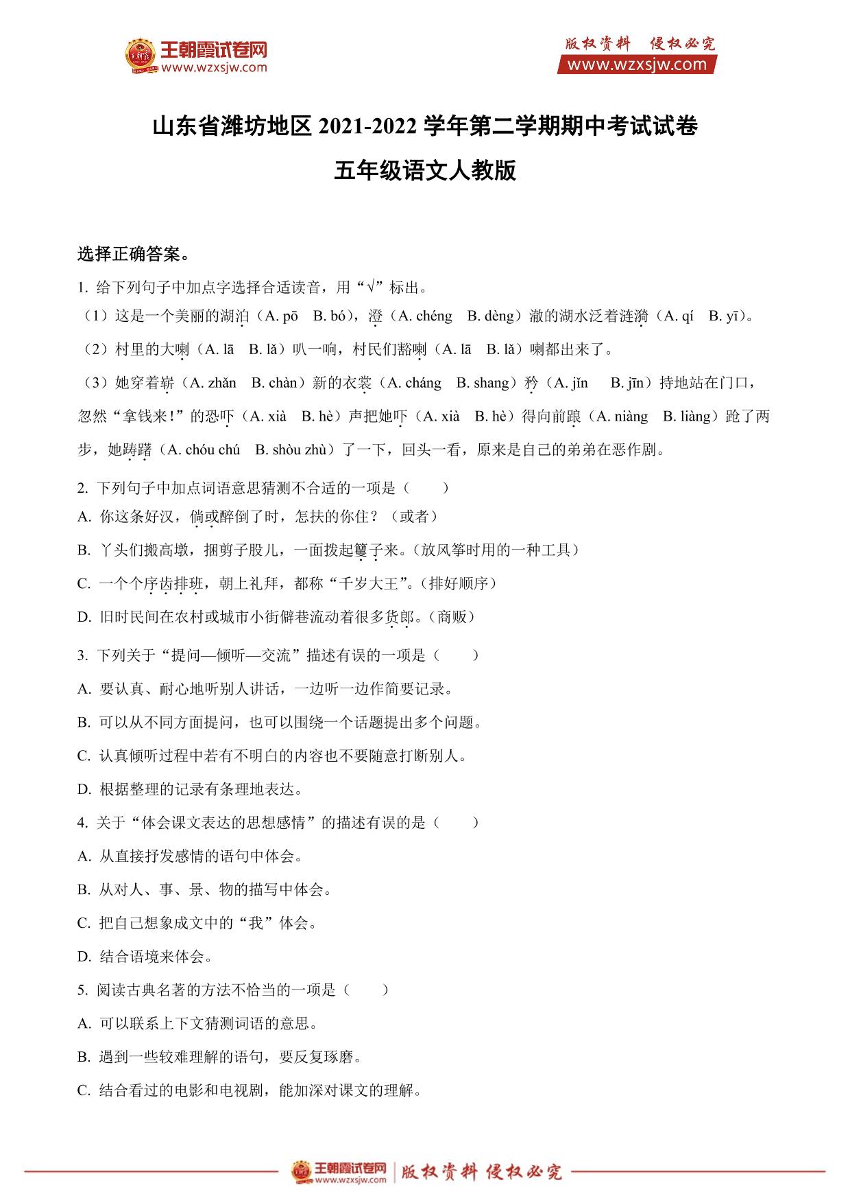 山东省潍坊地区2021-2022学年第二学期期中考试试卷五年级语文(人教版)