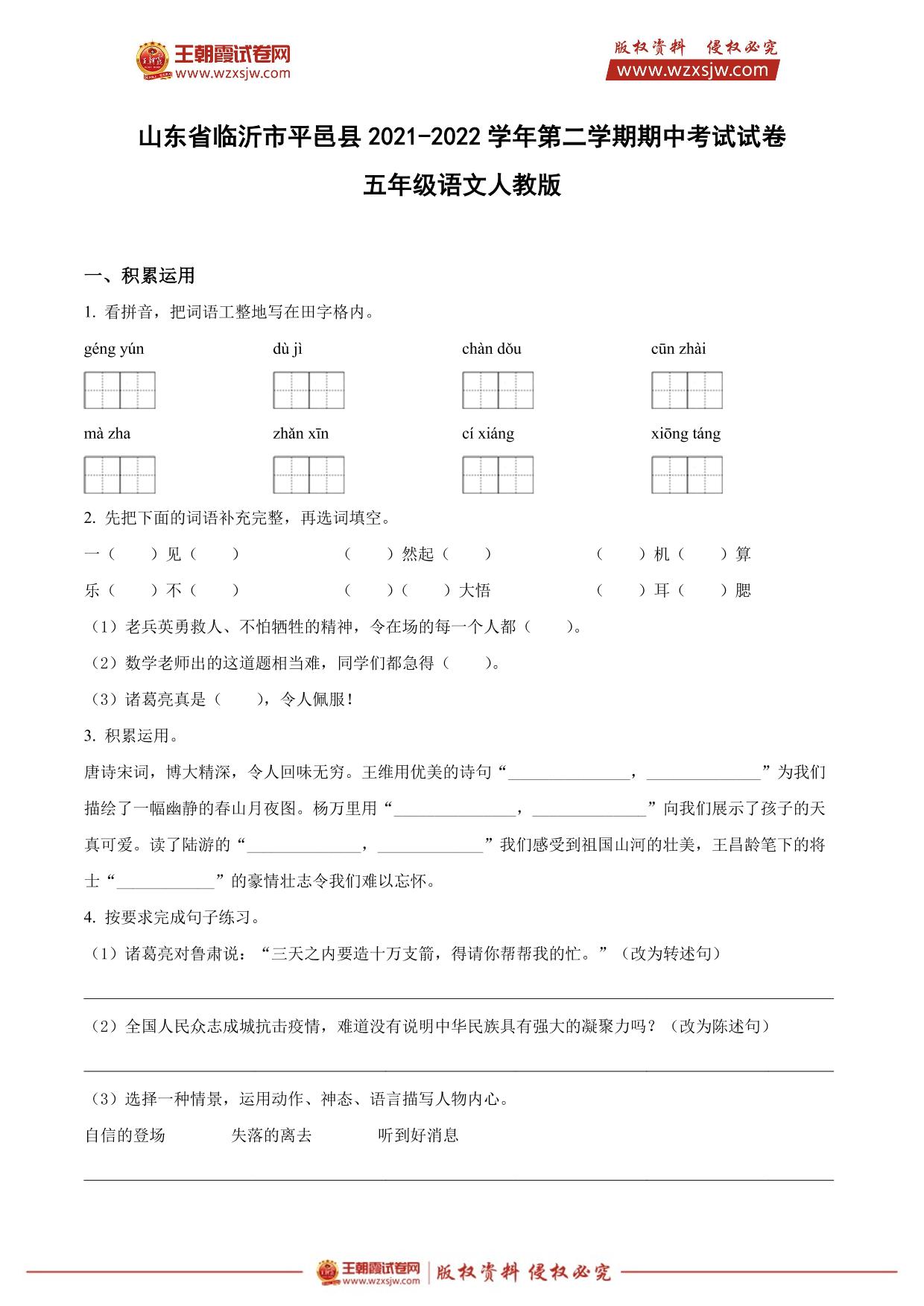 山东省临沂市平邑县2021-2022学年第二学期期中考试试卷五年级语文(人教版)
