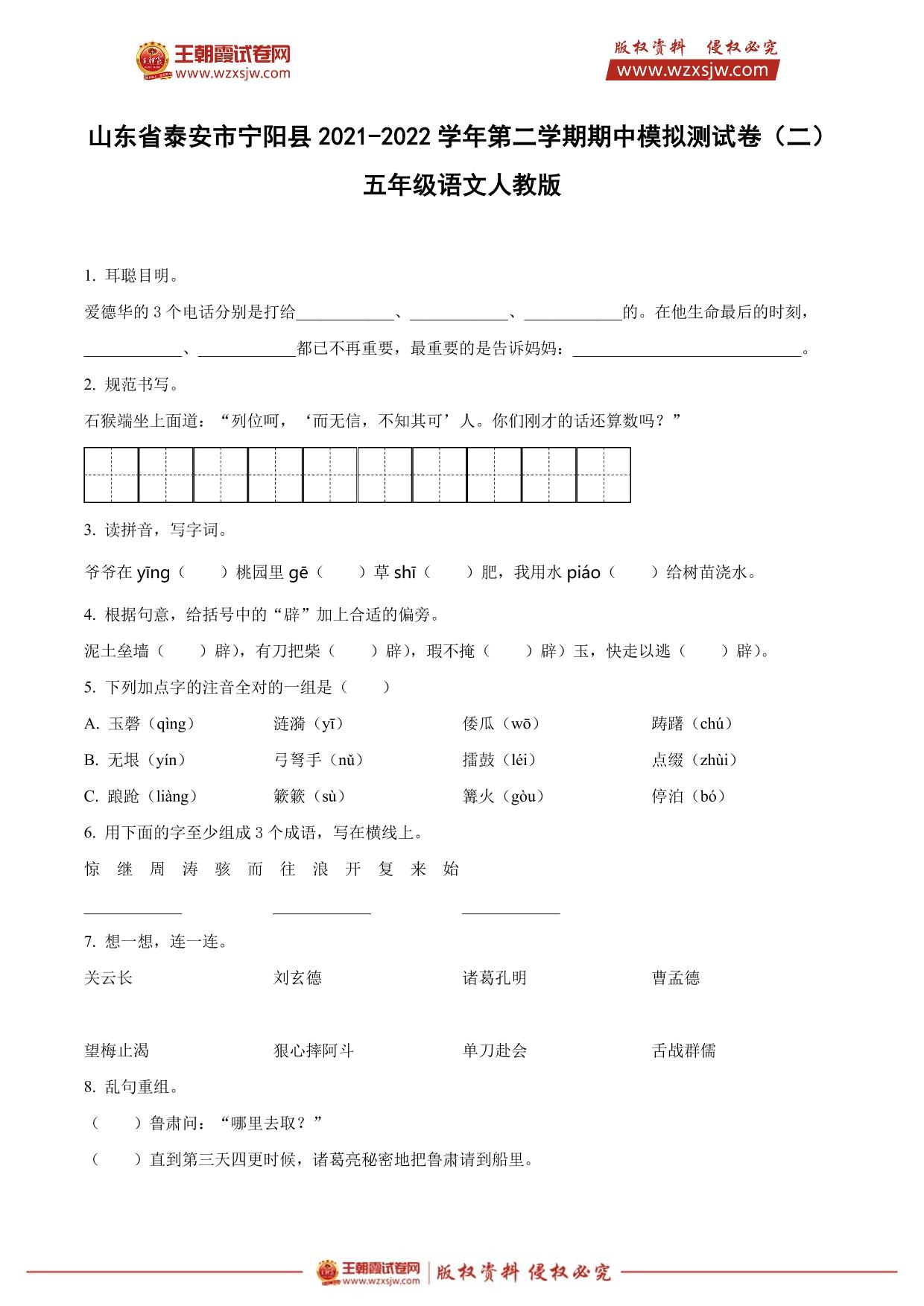 山东省泰安市宁阳县2021-2022学年第二学期期中模拟测试试卷(二)五年级语文(人教版)