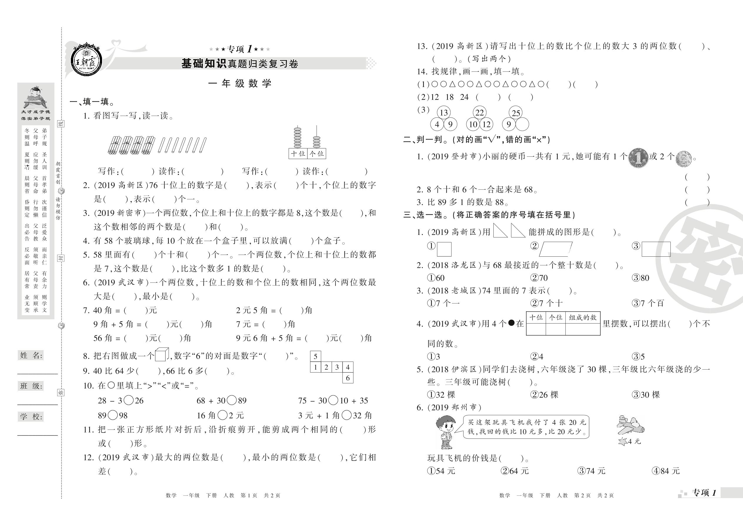 王朝霞期末专项卷——基础知识、计算真题归类复习卷一年级下册数学(人教版)_R210802213750【0】