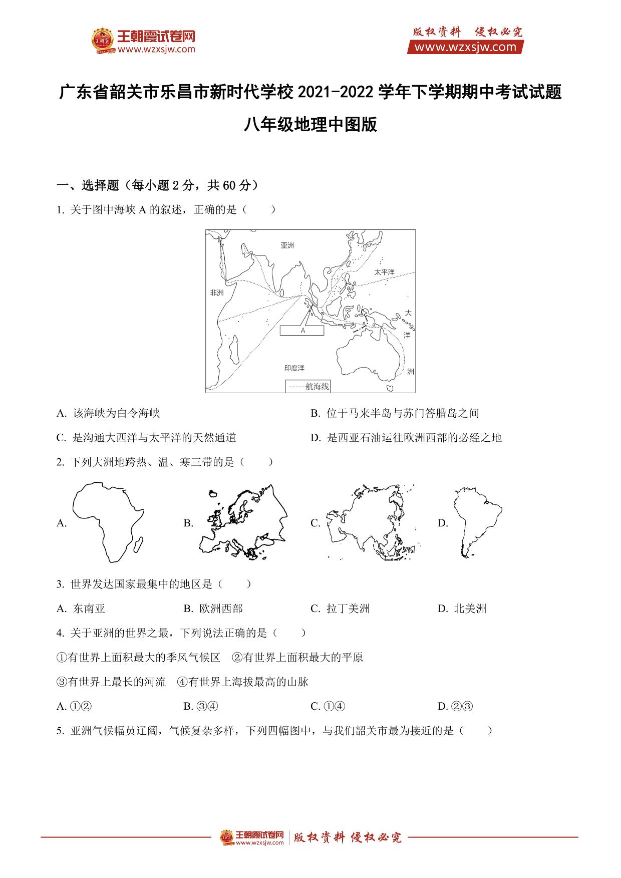 广东省韶关市乐昌市新时代学校2021-2022学年下学期期中考试试题八年级地理(中图版)