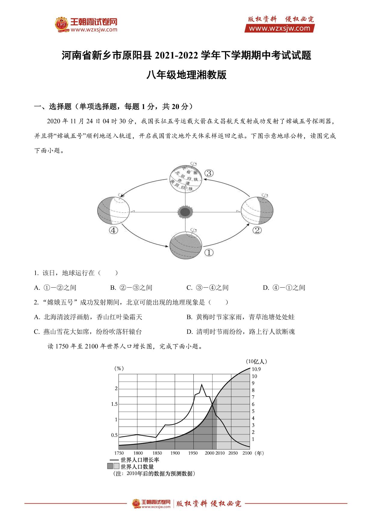 河南省新乡市原阳县2021-2022学年下学期期中考试试题八年级地理(湘教版)